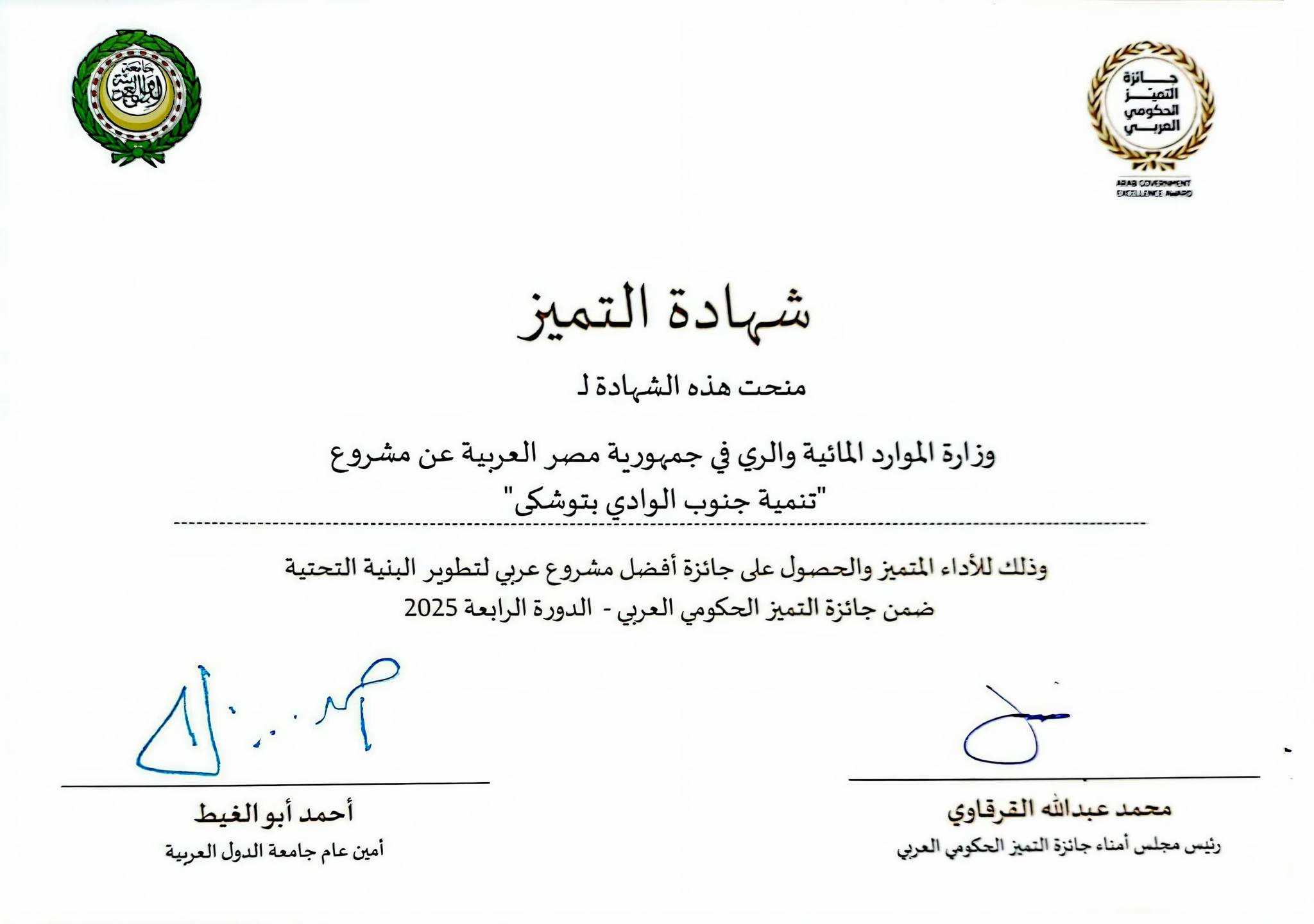 حققت وزارة الموارد المائية والري إنجازًا عربيًا كبيرا بفوزها بجائزة أفضل مشروع عربي لتطوير البنية التحتية عن "مشروع تنمية جنوب الوادى"، وذلك ضمن فعاليات الدورة الرابعة لجائزة التميز الحكومي العربي لعام ٢٠٢٥ .
