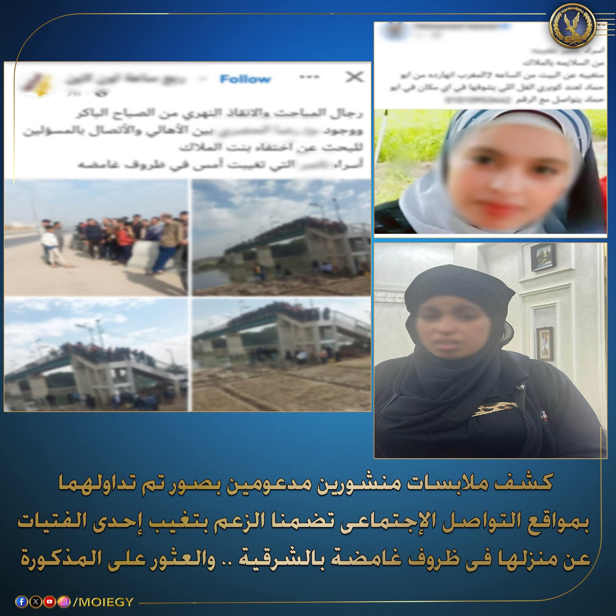 رصدت الأجهزة الأمنية بوزارة الداخلية تداول منشورين مدعومين بصور عبر مواقع التواصل الاجتماعى، تزعم تغيب إحدى الفتيات عن منزلها فى ظروف غامضة بمحافظة الشرقية.