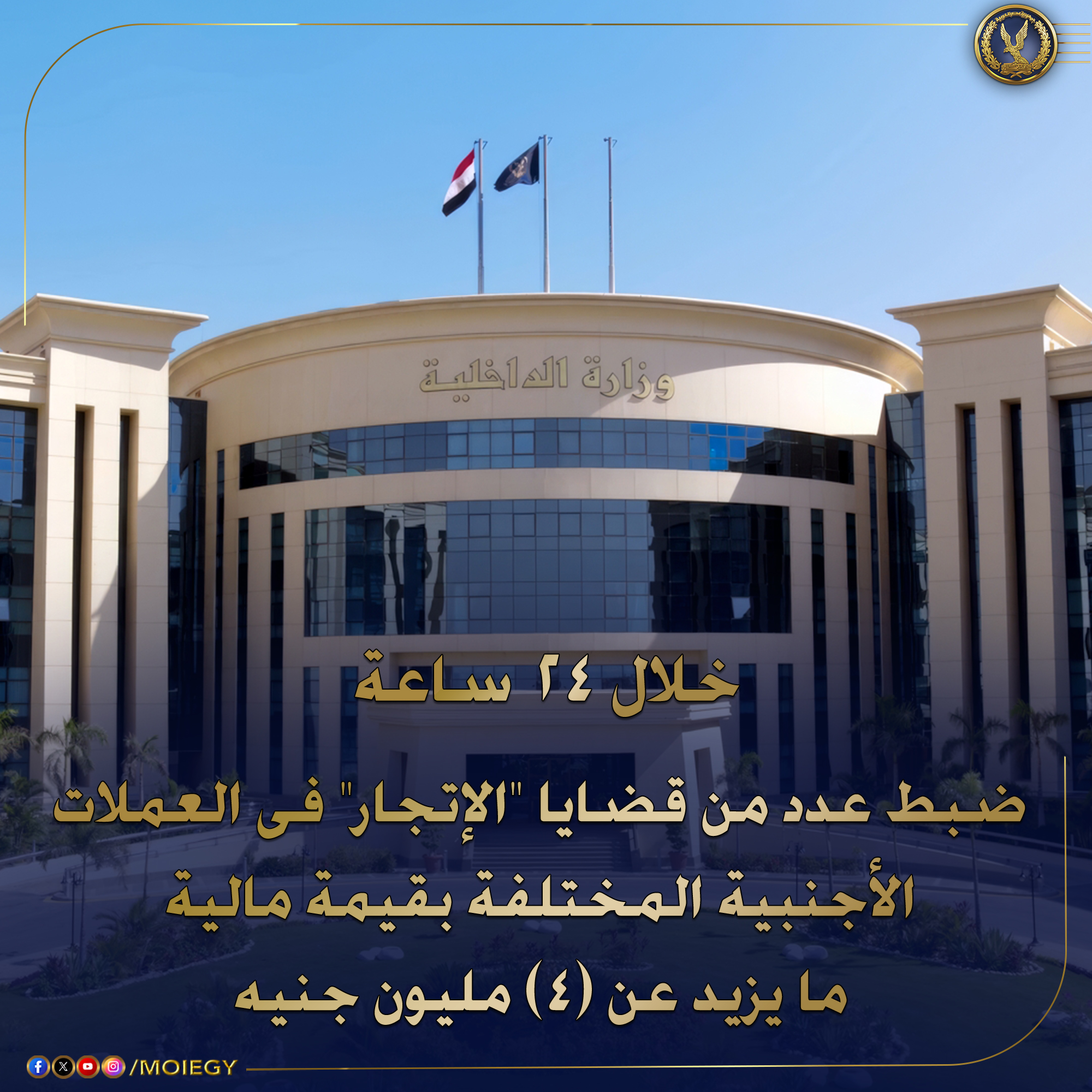 تمكنت الأجهزة الأمنية خلال 24 ساعة من ضبط عدد من قضايا الاتجار بالعملات الأجنبية المختلفة بقيمة إجمالية تزيد عن 4 ملايين جنيه، وقد تم اتخاذ الإجراءات القانونية اللازمة حيالها.