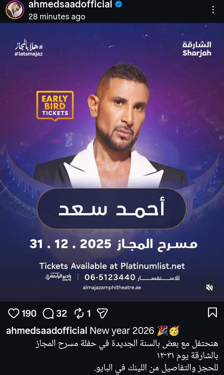 ونشر أحمد سعد الملصق الدعائي للحفل، وذلك عبر حسابه بموقع تبادل الصور والفيديوهات "انستجرام"، وعلق عليه قائلا: "سنة جديدة سعيدة 2026، هنحتفل مع بعض بالسنة الجديدة في حفلة مسرح المجاز بالشارقة يوم 12/31".