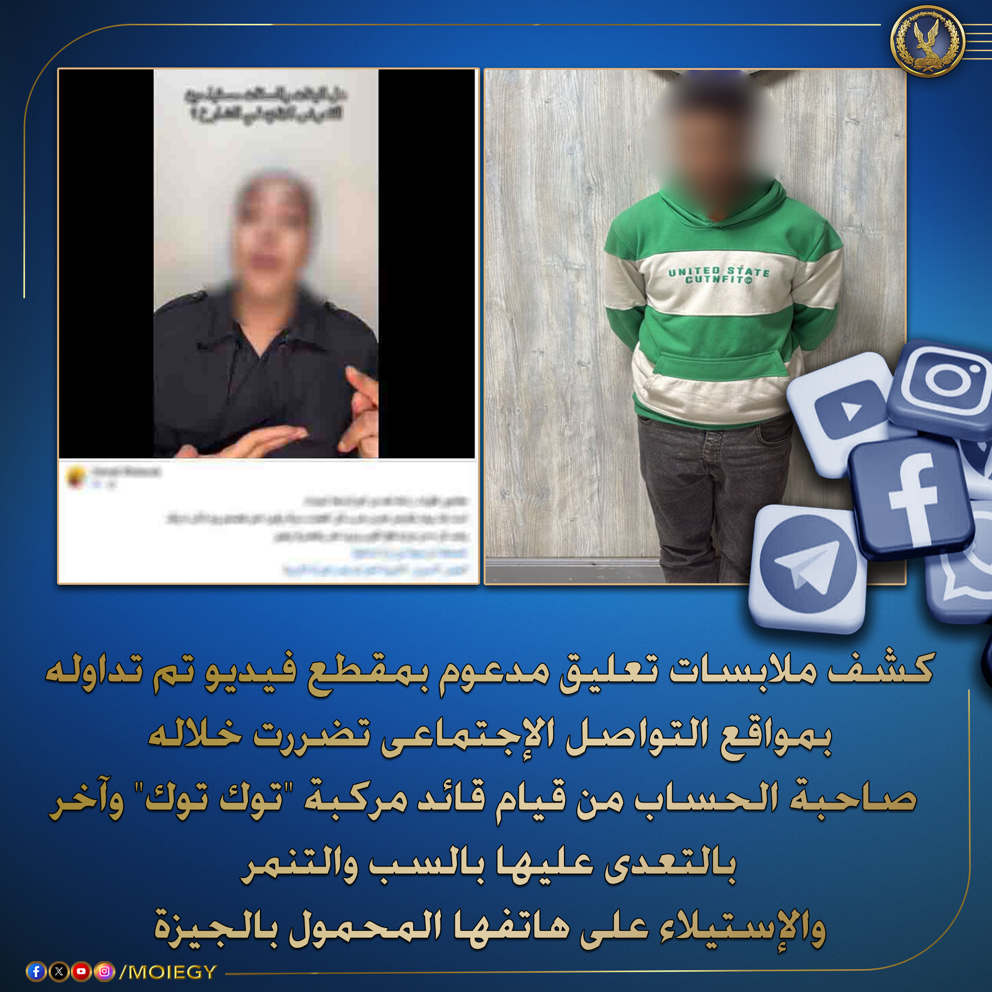 فى إطار كشف ملابسات تعليق مدعوم بمقطع فيديو تم تداوله بمواقع التواصل الإجتماعى تضررت خلاله صاحبة الحساب من قيام قائد مركبة "توك توك" وآخر بالتعدى عليها بالسب والتنمر والإستيلاء على هاتفها المحمول بالجيزة.