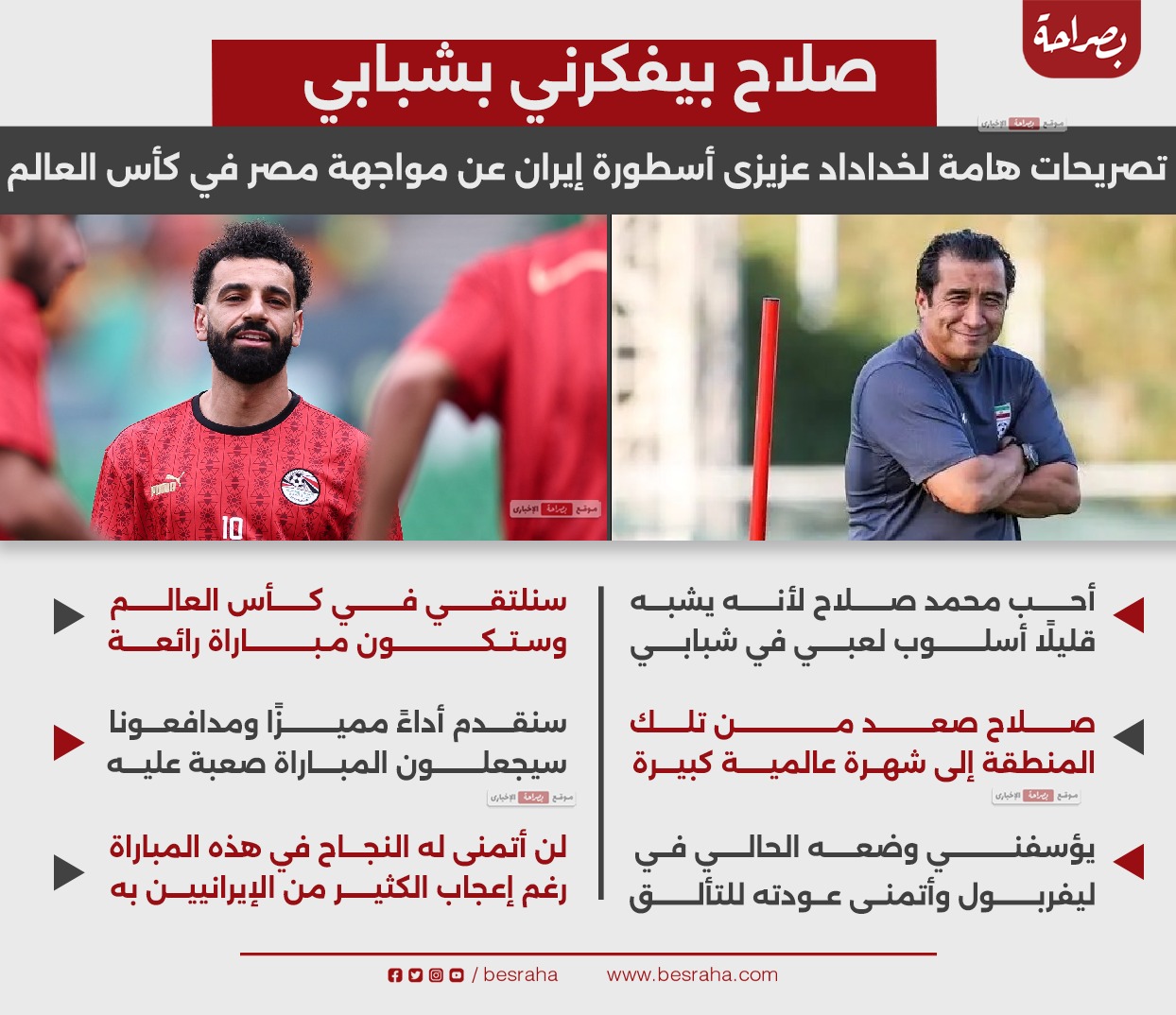 وقال خداداد عزيري في تصريحات خاصة لـ"بصراحة":"شخصيًا، أحب محمد صلاح، خصوصًا لأن أسلوب لعبه يشبه قليلًا الطريقة التي كنت ألعب بها في شبابي".