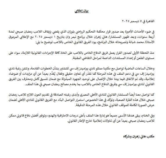 خلال الأحداث الأخيرة بعد صدور قرار محكمة التحكيم الرياضي بلوزان الذي يقضي بإيقاف اللاعب رمضان صبحي لمدة أربعة سنوات، وبعد ظهور المستشار/ هاني زهران خلال برنامج نبمر وان بتاريخ 1 ديسمبر 2025 مع الإعلامي المرموق الأستاذ/ محمد شبانة وتصريحاته خلال البرنامج، يود الفريق القانوني الخاص باللاعب توضيح ما يلي: