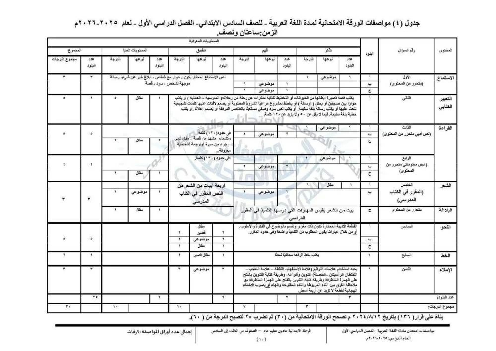 وزارة التربية والتعليم تعلن مواصفات امتحان اللغة العربية للفصل الدراسي الأول 2025/2026 لطلاب الابتدائي