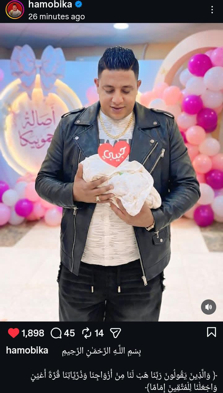 وعلق حمو بيكا قائلا: “بسم الله الرحمن الرحيم والذين يقولون ربنا هب لنا من أزواجنا وذرياتنا قرة أعين، واجعلنا للمتقين إماما 2025-12-8، الحمدلله على جميل عطاياه رزقنا اليوم بمولوة أسميناها أصالة حمو بيكا، فاللهم أنبتها نباتا حسنا، واجعلها قرة عين لنا، بارك لنا فيها وارزقنا برها، واجعلها ذرية صالحة لنا، اللهم آمين”.