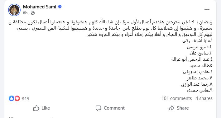 وكتب محمد سامي عبر حسابه بموقع التواصل الاجتماعي “فيسبوك”: "رمضان 2026 في مخرجين هتقدم أعمال لأول مرة ، إن شاء الله كلهم هيشرفونا و هيعملوا أعمال تكون مختلفة و متميزة ، و هيثبتوا إن شغلانتنا كل يوم بطلع ناس جامدة و جديدة و هيضيفوا لمكتبة الفن المصري ، بتمنى ليهم كل التوفيق و النجاح و أهلا بيكم زملاء أعزاء و بيكم العزوة هتكبر ، مايا أشرف زكى، عمرو موسى، سامح علاء، عبد الرحمن أبو غزالة، خالد سعيد، هادي بسيونى، محمد طاهر، رضا عبد الرازق، هاني حمدي".