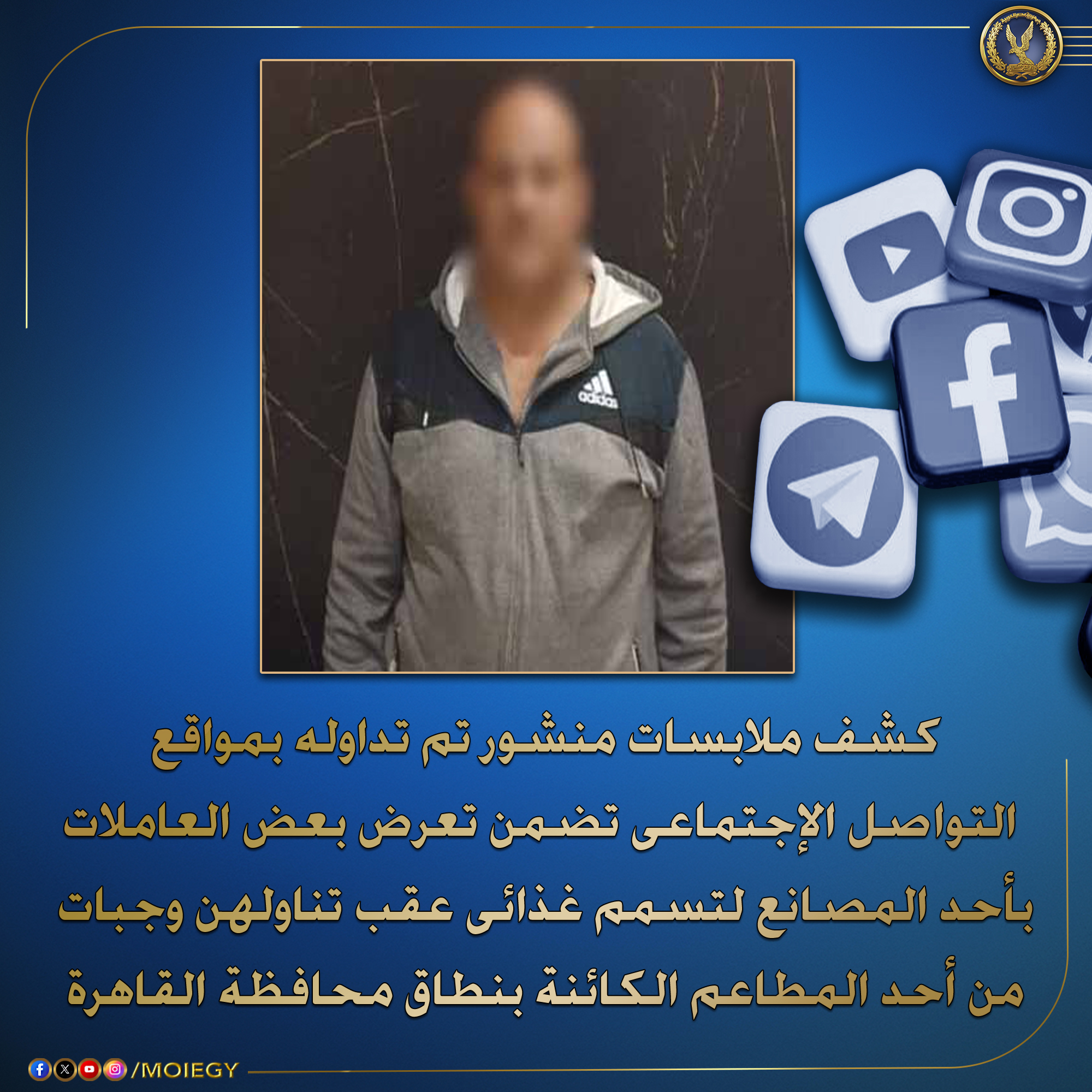 في إطار كشف ملابسات منشور تد تداوله بمواقع التواصل الإجتماعي تضمن تعرض عدد من العاملات بأحد المصانع لتسمم غذائي من خلال تناولهن وجبات من أحد المطاعم بنطاق محافظة القاهرة.