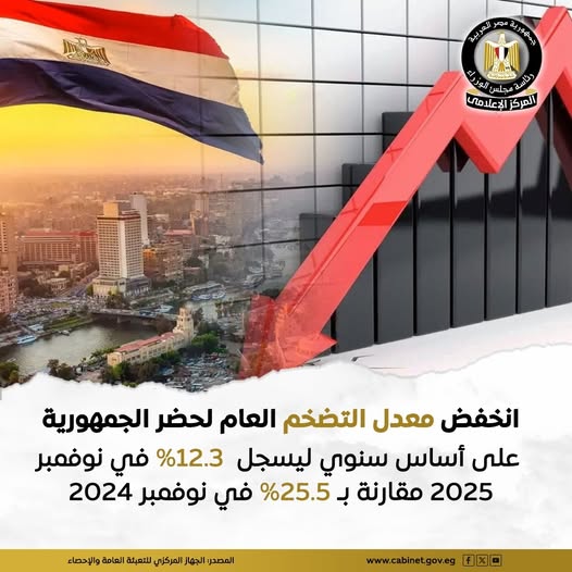 انخفض معدل التضخم العام لمدينة الجمهورية على أساس سنوي بمقدار 13.2 نقطة مئوية، مسجلاً 12.3% في نوفمبر 2025، مقارنة بـ25.5% في نفس الشهر من العام الماضي.