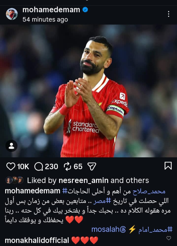 حرص النجم محمد إمام على دعم محمد صلاح في أزمته، حيث نشرت له صورة عبر حسابه بموقع تبادل الصور والفيديوهات "انستجرام"، وعلق عليها قائلا: "محمد صلاح من أهم وأحلى الحاجات اللي حصلت في تاريخ مصر، متابعين بعض من زمان بس أول مرة هقوله الكلام ده، بحبك جدا وبفتخر بيك في كل حتة، ربنا يحفظك ويوفقك دايما".