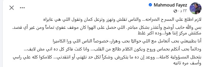 واعتذر محمود فايز عبر بوست على صفحته على الفيسبوك قائلا :"لازم اطلع علي المسرح الصراحة ،والناس تقلش وتهزر وتزعل كمان وتقول اللي هي عايزاه"
