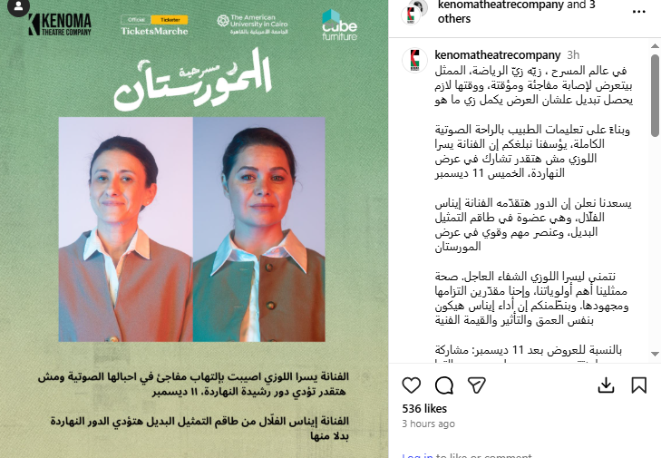 وأضاف البيان: "بناءً على تعليمات الطبيب بالراحة الصوتية الكاملة، يؤسفنا نبلغكم إن الفنانة يسرا اللوزي مش هتقدر تشارك في عرض النهاردة، الخميس 11 ديسمبر، يسعدنا نعلن إن الدور هتقدّمه الفنانة إيناس الفلّال، وهي عضوة في طاقم التمثيل البديل، وعنصر مهم وقوي في عرض المورستان.