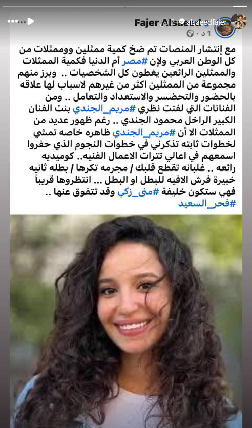 كتبت الاعلامية فجر السعيد عبر منصات التواصل الاجتماعي انستجرام:مع إنتشار المنصات تم ضخ كمية ممثلين ووممثلات من كل الوطن العربي ولإن مصر أم الدنيا فكمية الممثلات والممثلين الرائعين يغطون كل الشخصيات.ثم قالت فجر السعيد: وبرز منهم مجموعة من الممثلين اكثر من غيرهم لاسباب لها علاقه بالحضور والتحضسر والاستعداد والتعامل، ومن الفنانات التي لفتت نظري مريم الجندي بنت الفنان الكبير الراحل محمود الجندي، رغم ظهور عديد من الممثلات الا أن مريم الجندي ظاهره خاصه تمشي لخطوات ثابته.تذكرني في خطوات النجوم الذي حفروا اسمعهم في اعالي تترات الاعمال الفنيه، كوميديه رائعه، غلبانه تقطع قلبك، مجرمه تكرها، بطله ثانيه خبيرة فرش الافيه للبطل او البطل، انتظروها قريباً فهي ستكون خليفة منى زكي وقد تتفوق عنها فحر السعيد.