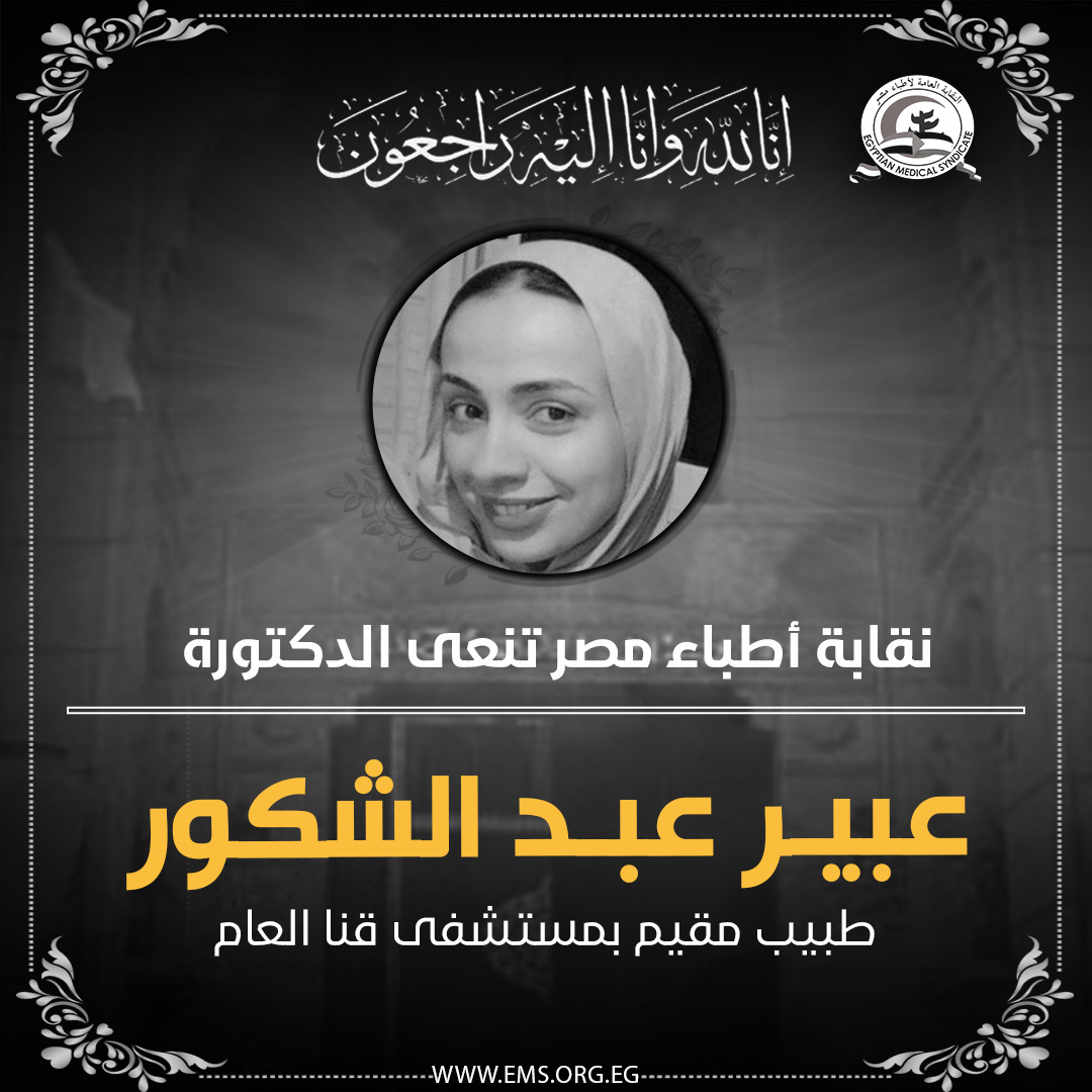 نعت النقابة العامة للأطباء ببالغ الحزن والأسى، الدكتورة عبير عبد الشكور طبيب مقيم بمستشفى قنا العام، التي انتقلت إلى رحمة الله إثر حادث انقلاب سيارة أثناء توجهها للمشاركة في مؤتمر لأمراض النساء والتوليد بمدينة الغردقة.