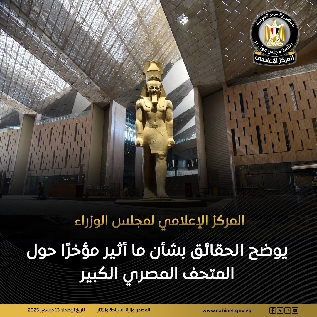 نشر المركز الإعلامي لمجلس الوزراء بيانًا عبر منصاته الرسمية، أوضح من خلاله عددًا من الحقائق بشأن ما أثير مؤخرًا حول المتحف المصري الكبير.