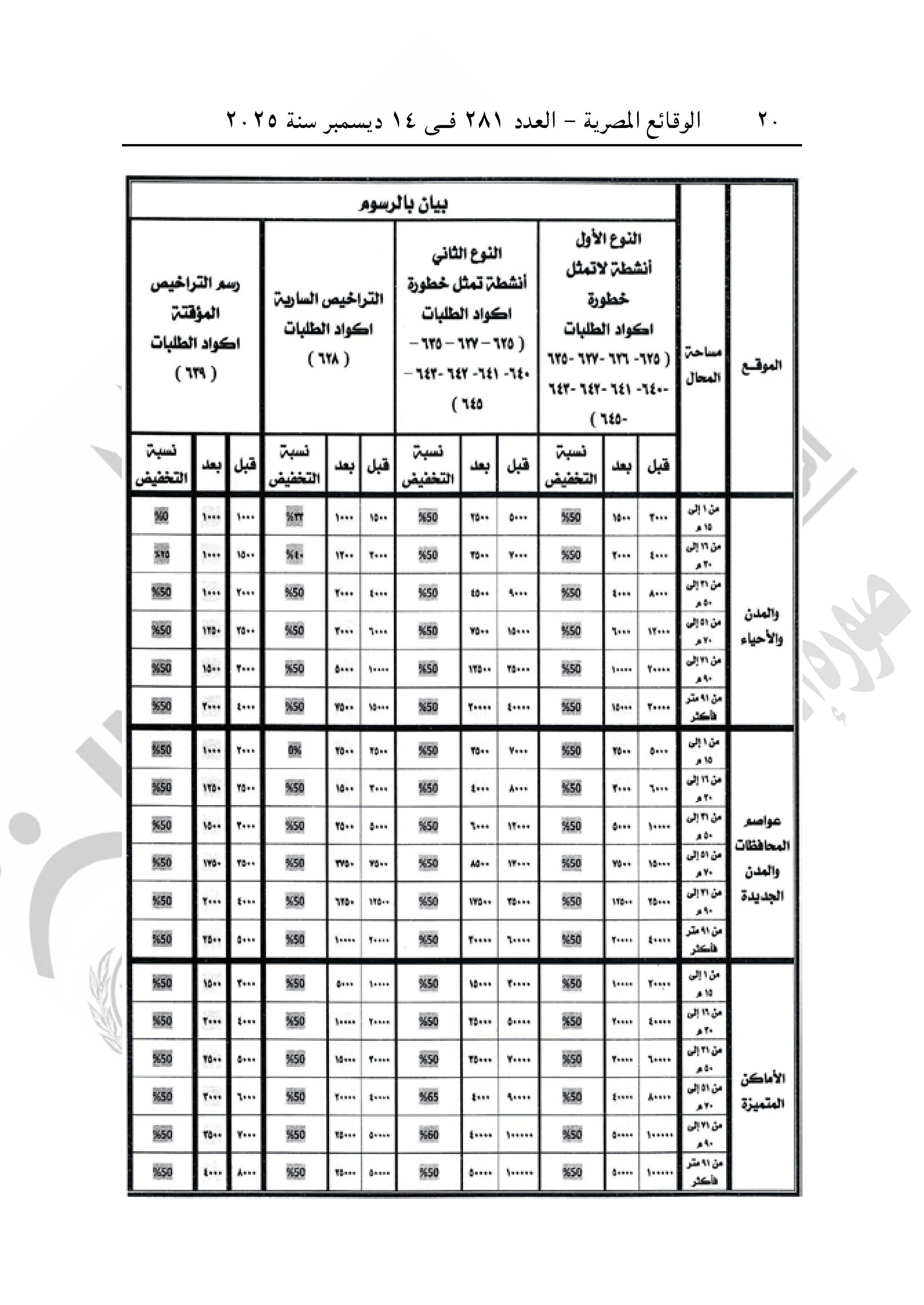 نشرت الجريدة الرسمية في عددها الصادر اليوم الأحد 14 ديسمبر 2025، قرار اللجنة العليا لتراخيص المحال العامة برئاسة الدكتورة منال عوض، وزيرة التنمية المحلية، رقم 1 لسنة 2025 بشأن تخفيض فئات رسوم ترخيص المحال العامة.