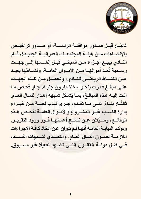 ثانيًا: قبل صدور موافقة رئاسة الجمهورية أو الحصول على تراخيص البناء من هيئة المجتمعات العمرانية الجديدة، قام النادي ببيع أجزاء من المباني قبل إنشائها إلى جهات رسمية أموالها أموال عامة، ويقع نشاطها بعيدًا عن النشاط الرياضي للنادي، وتحصل من تلك الجهات على مبالغ مالية قدرها 780 مليون جنيه، جارٍ فحص ما آلت إليه هذه المبالغ، بما يشكل شبهة إهدار للمال العام، الأمر الذي يستوجب اتخاذ إجراءات صارمة للحفاظ عليه.