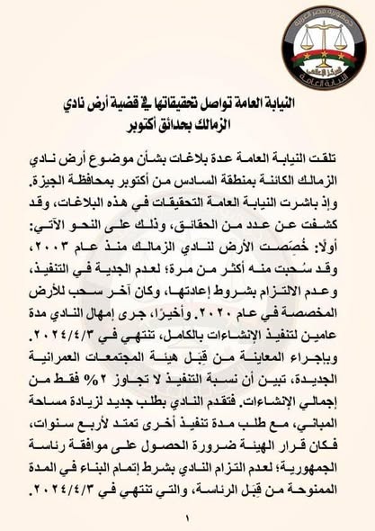 أصدرت النيابة العامة بيانًا رسميًا كشفت فيه عن مستجدات التحقيقات الجارية بشأن قضية أرض نادي الزمالك الكائنة بمنطقة حدائق أكتوبر، وذلك في ضوء البلاغات المقدمة حول تخصيص الأرض، ومدى الالتزام بشروط البناء، والتصرفات المالية المرتبطة بها، مؤكدة استمرارها في اتخاذ الإجراءات القانونية اللازمة لحماية المال العام.