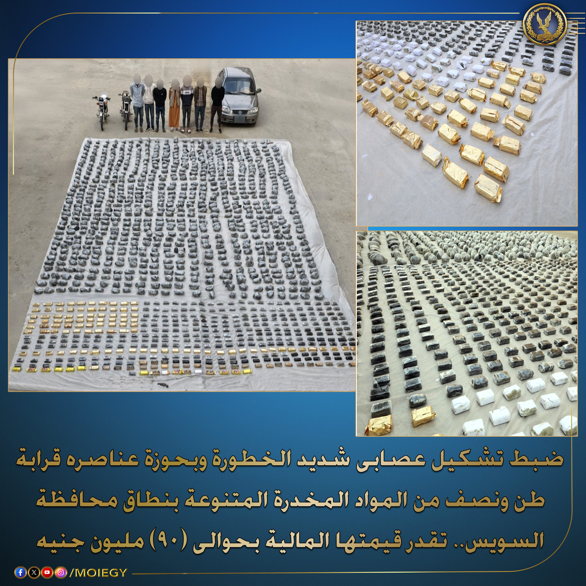 وعقب تقنين الإجراءات، تم تتبع عناصر التشكيل وإعداد الأكمنة اللازمة، حيث جرى ضبطهم بنطاق محافظة السويس، وبحوزتهم نحو طن ونصف من المواد المخدرة المتنوعة، شملت مخدر «الهيدرو» و«الحشيش».