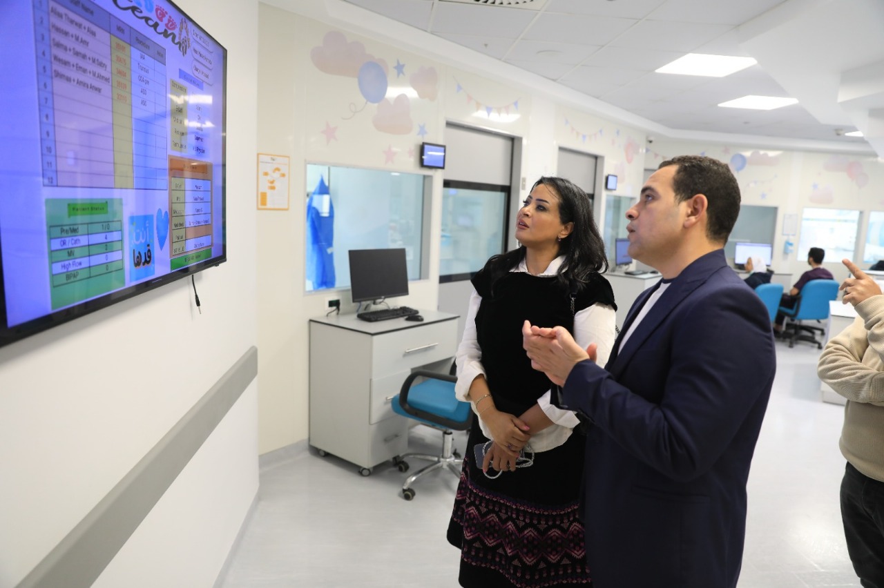 وأضافت: «سعيدة بمستوى التطور اللي شوفته وما كنتش متخيلاه، مثلاً في عيادات القلب، وغرف عمليات القلب المفتوح، خصوصًا إن هنا عمليات القلب المفتوح بتتعمل لأطفال صغيرين جداً عمرهم أيام، والمكان ده بينقذهم ويغير حياتهم ويغير حياة أسرتهم، والنهارده شوفت أمهات في عينيهم تطلع ورجاء وسعادة إن أولادهم بقوا أحسن، وكنت سعيدة جداً كمان لما دخلت قسم السكر من النوع الأول اللي بيصيب الأطفال أكتر، وشوفت ازاي حياة بعض الأطفال بتتغير تماماً، وشوفت الجهد اللي بتبذله المستشفى مش عشان تعالج الأطفال بس، ولكن كمان عشان يحسنوا حياة الأطفال ويوفروا عليهم أكبر عدد ممكن من "الشكّات" اللي بيتعرض لها الطفل».