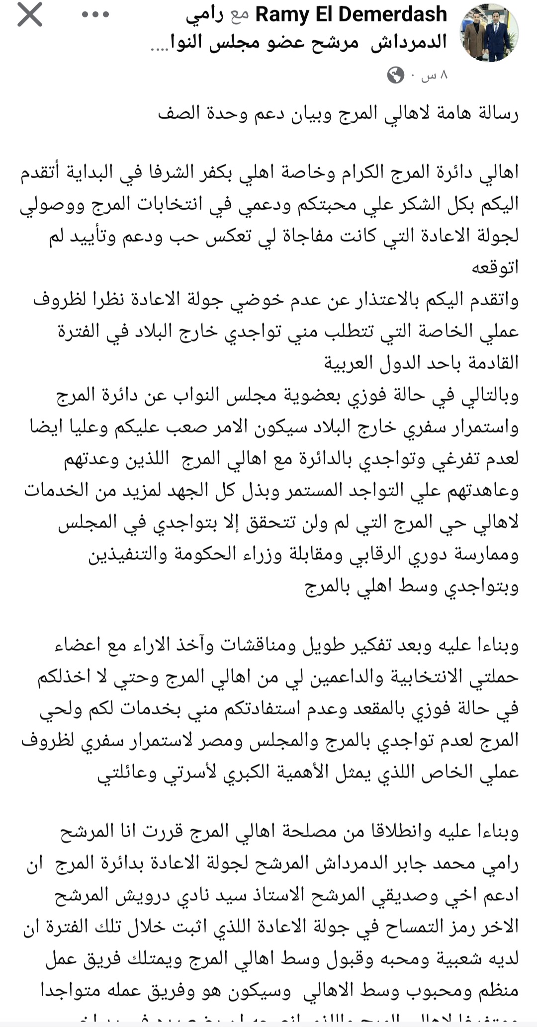 وبناءا عليه وبعد تفكير طويل ومناقشات وآخذ الاراء مع اعضاء حملتي الانتخابية والداعمين لي من اهالي المرج وحتي لا اخذلكم في حالة فوزي بالمقعد وعدم استفادتكم مني بخدمات لكم ولحي المرج لعدم تواجدي بالمرج والمجلس ومصر لاستمرار سفري لظروف عملي الخاص اللذي يمثل الأهمية الكبري لأسرتي وعائلتي