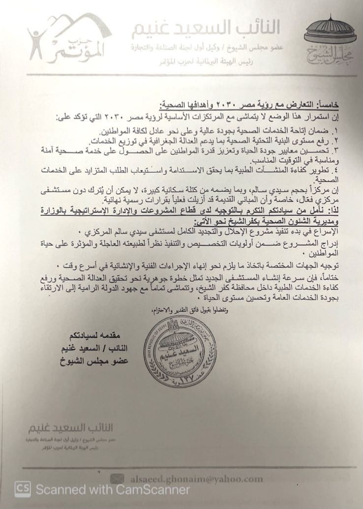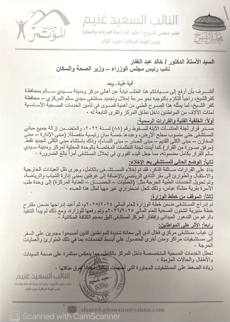 النائب السعيد غنيم يحصل على موافقة وزارة الصحة لإحلال وتجديد مستشفى سيدي سالم المركزي