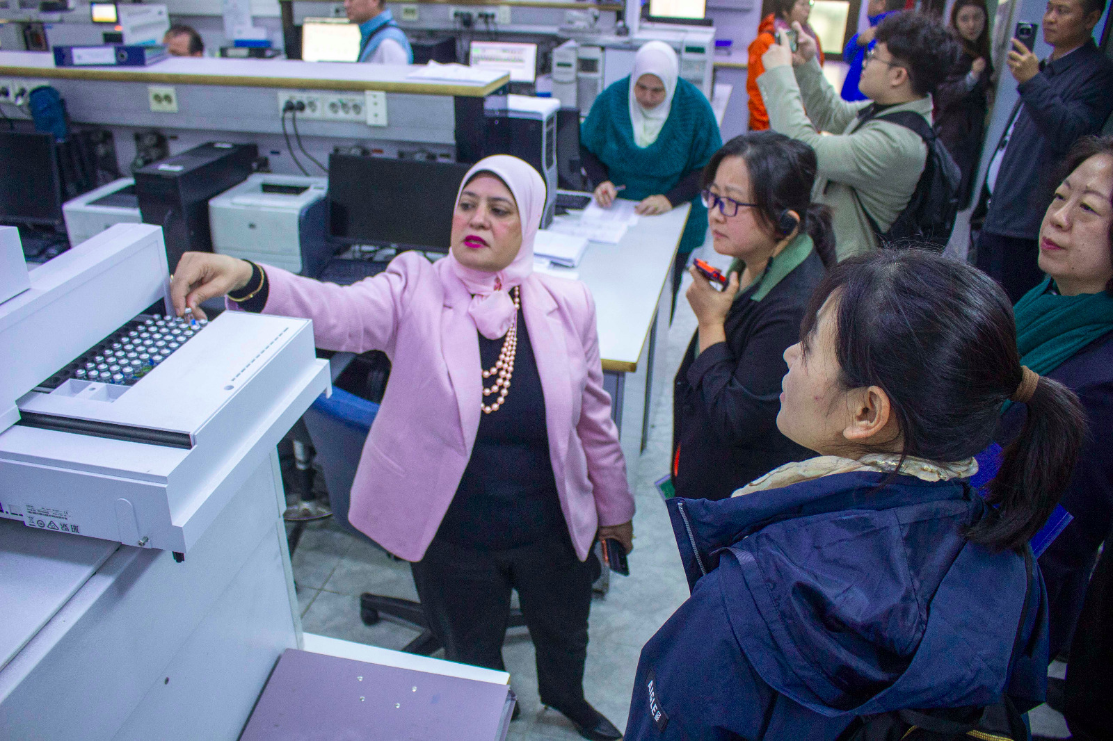 وتفقد الوفد الصيني، أيضا، أقسام المعمل المختلفة، حيث تم إستعراض ما يقوم به المعمل من تحليل للعينات من الصادرات الغذائية أو العينات الواردة من هيئة سلامة الغذاء أو الحجر الزراعي، حيث تبلغ السعة اليومية له نحو 1300 عينة، كما تم أيضا إستعراض دور كل قسم بالمعمل في الكشف عن الملوثات المختلفة وعدد الإختبارات المعتمدة بكل قسم لخدمة الصادرات المصرية وهيئة سلامة الغذاء.