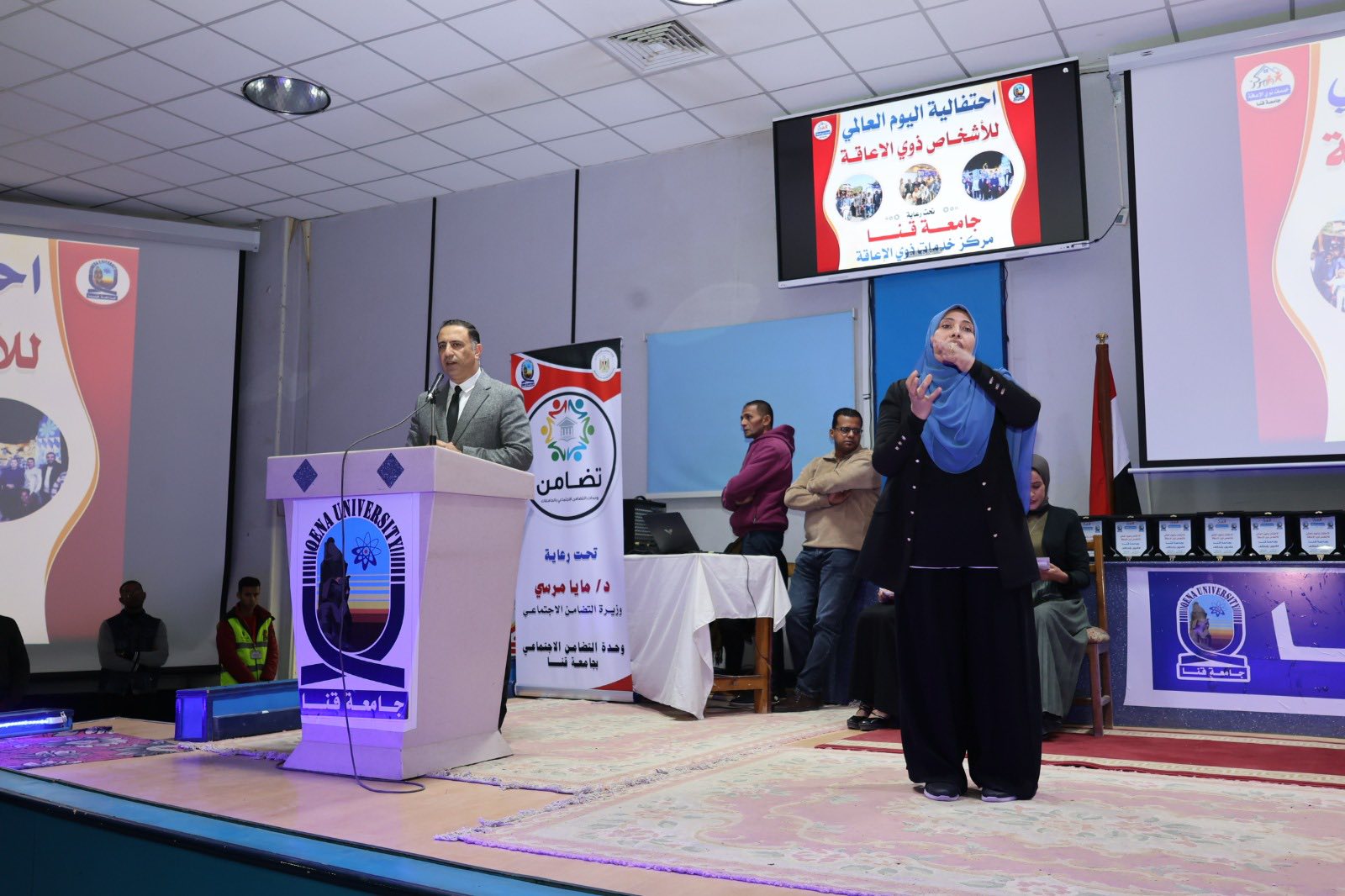 شارك الدكتور محمد العقبي مساعد وزيرة التضامن الاجتماعي للاتصال الاستراتيجي والمشرف العام على مشروع وحدات التضامن الاجتماعي في احتفالية جامعة قنا باليوم العالمي للأشخاص ذوي الإعاقة.