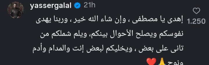 "ربنا يهدى نفوسكم"..ياسر جلال يدعم مصطفى أبو سريع بعد انفصاله عن زوجته