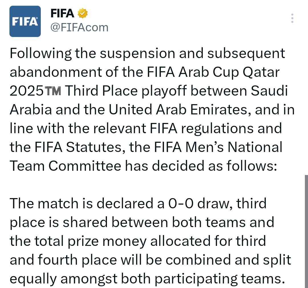 أعلن الاتحاد الدولي لكرة القدم (فيفا) بشكل رسمي إلغاء مباراة تحديد المركز الثالث في بطولة كأس العرب قطر 2025 بين المنتخبين السعودي والإماراتي، وذلك عقب تعليقها وعدم استكمالها (بسبب الأحوال الجوية)