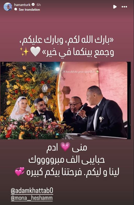 ونشرت حنان ترك صورة للعروسين، وذلك عبر حسابها بموقع تبادل الصور والفيديوهات “انستجرام”، وعلقت عليها قائلة: “بارك الله لكم وبارك عليكم، وجمع بينكم في خير، منى وآدم حبايب قلبي، فرحتنا بيكم كبيرة”.