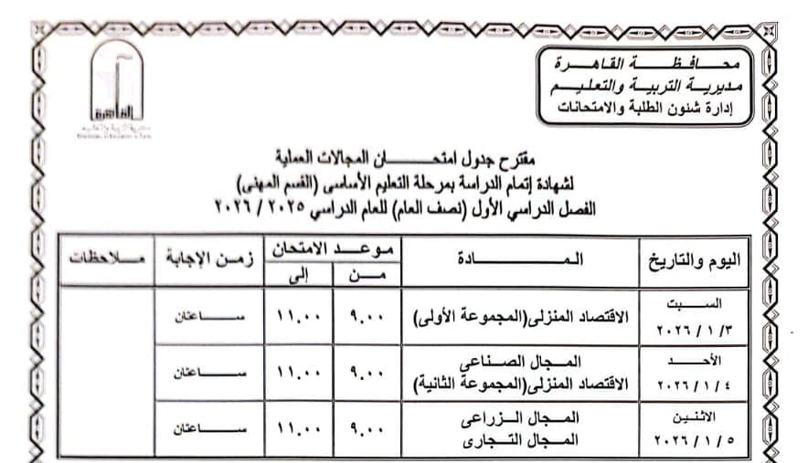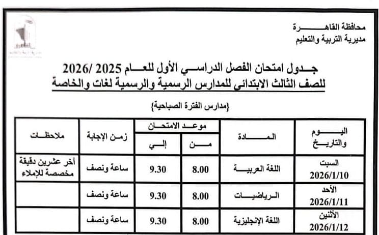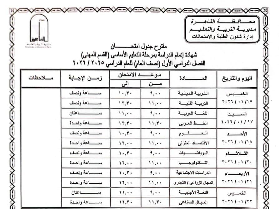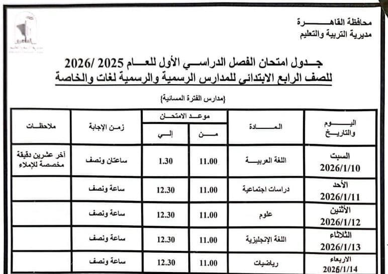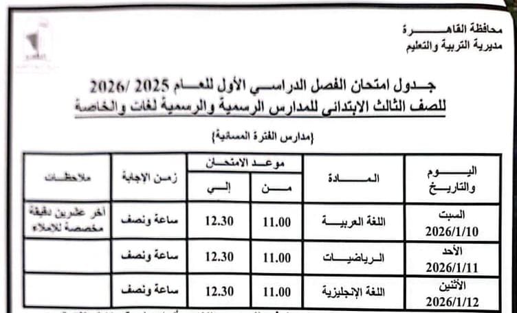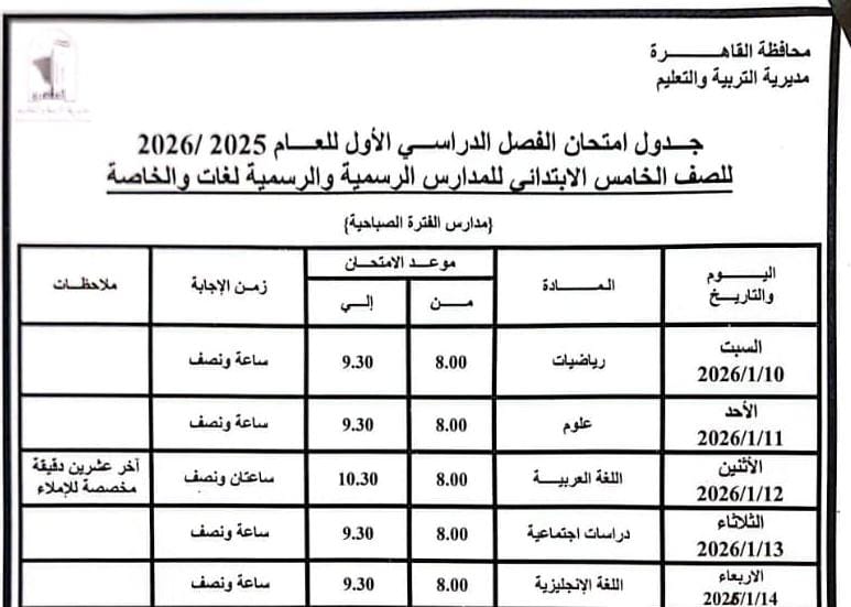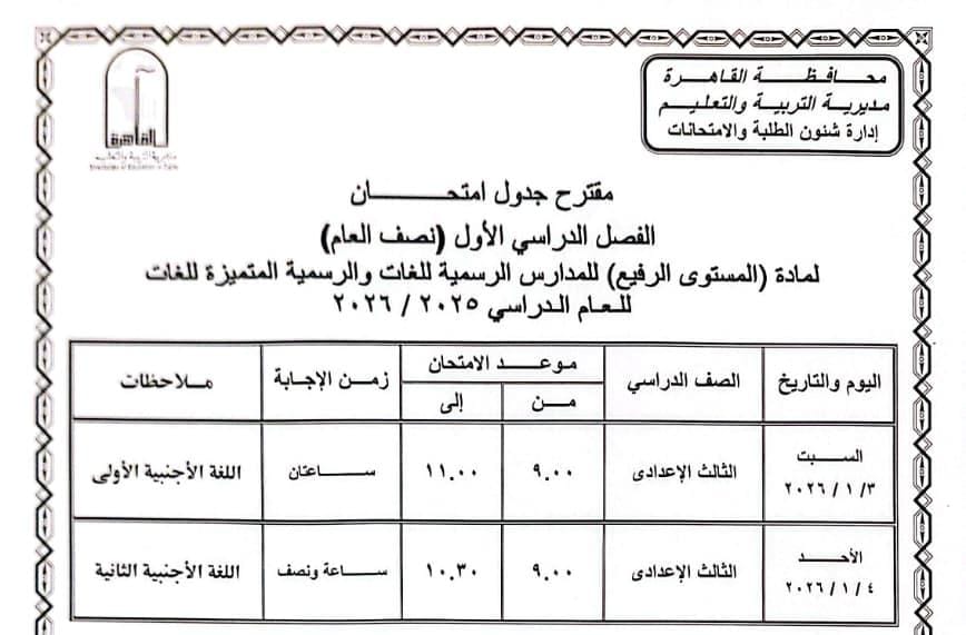 محافظ القاهرة يعتمد جدول امتحانات الفصل الدراسي الأول لعام 2025 / 2026