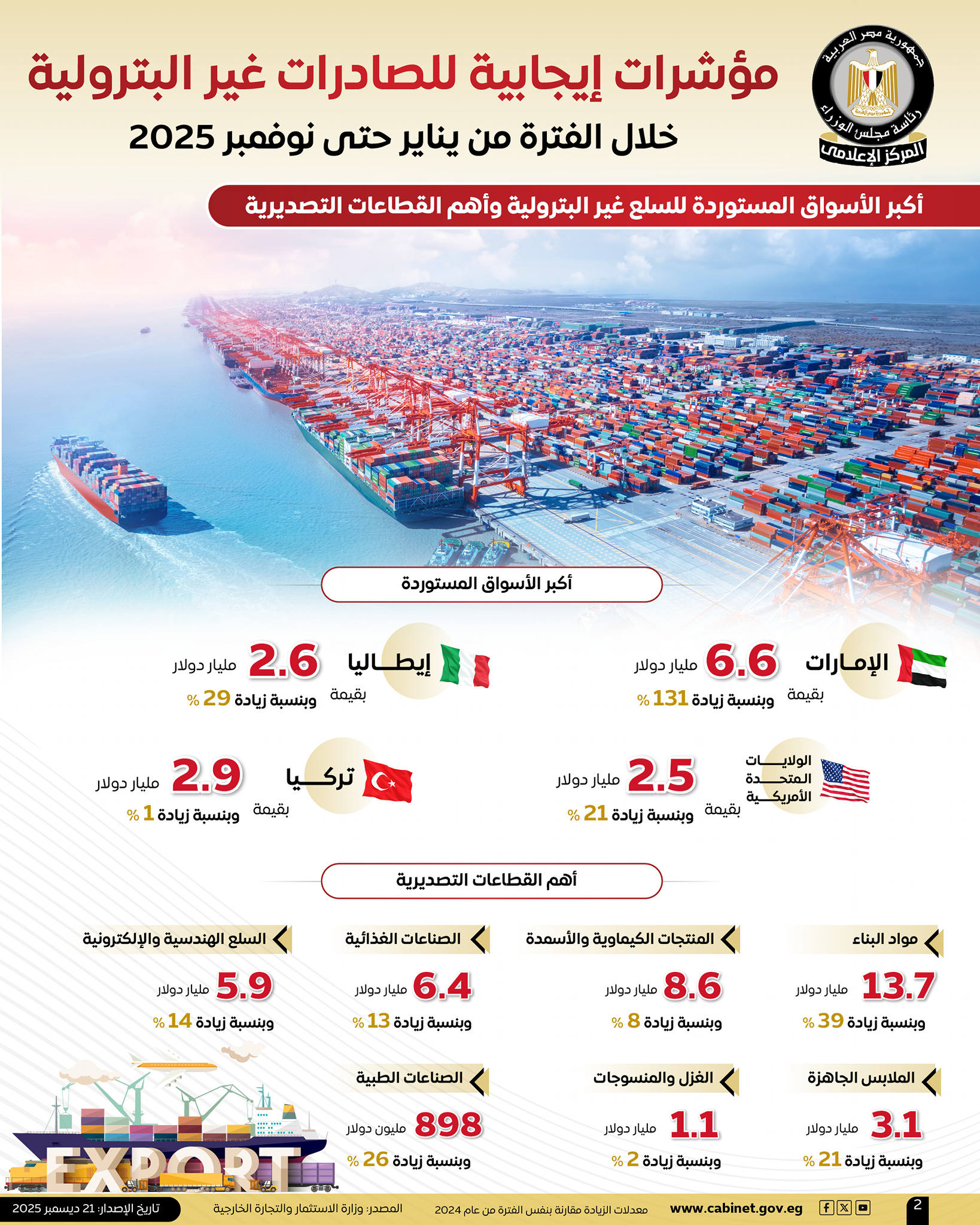 واستعرضت الإنفوجرافات، أهم القطاعات التصديرية التي ساهمت في نمو إجمالي الصادرات غير البترولية، ونسبة زيادتها خلال الفترة من يناير حتى نوفمبر 2025، مقارنة بالفترة ذاتها من عام 2024، والتي تضمنت قطاع مواد البناء بقيمة 13.7 مليار دولار، وبنسبة زيادة 39%، وقطاع المنتجات الكيماوية والأسمدة بقيمة 8.6 مليار دولار، وبنسبة زيادة 8%، وقطاع الصناعات الغذائية بقيمة 6.4 مليار دولار، وبنسبة زيادة 13%، بالإضافة إلى قطاع السلع الهندسية والإلكترونية بقيمة 5.9 مليار دولار، وبنسبة زيادة 14%.