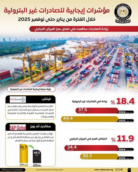 نشر المركز الإعلامي لمجلس الوزراء، عددًا من الإنفوجرافات عبر منصاته على مواقع التواصل الاجتماعي، استعرض من خلالها المؤشرات الإيجابية للصادرات غير البترولية خلال الفترة من يناير حتى نوفمبر 2025.