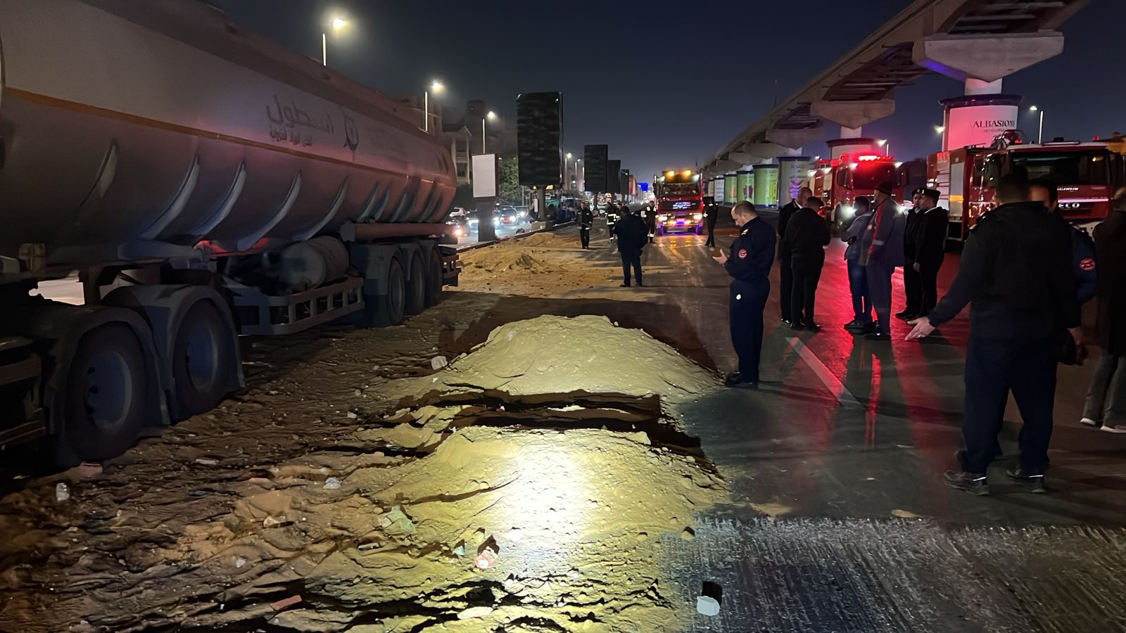 التجمع يشهد تسرب 1000 لتر بنزين بعد اصطدام سيارة خزان بلوحة إعلانات