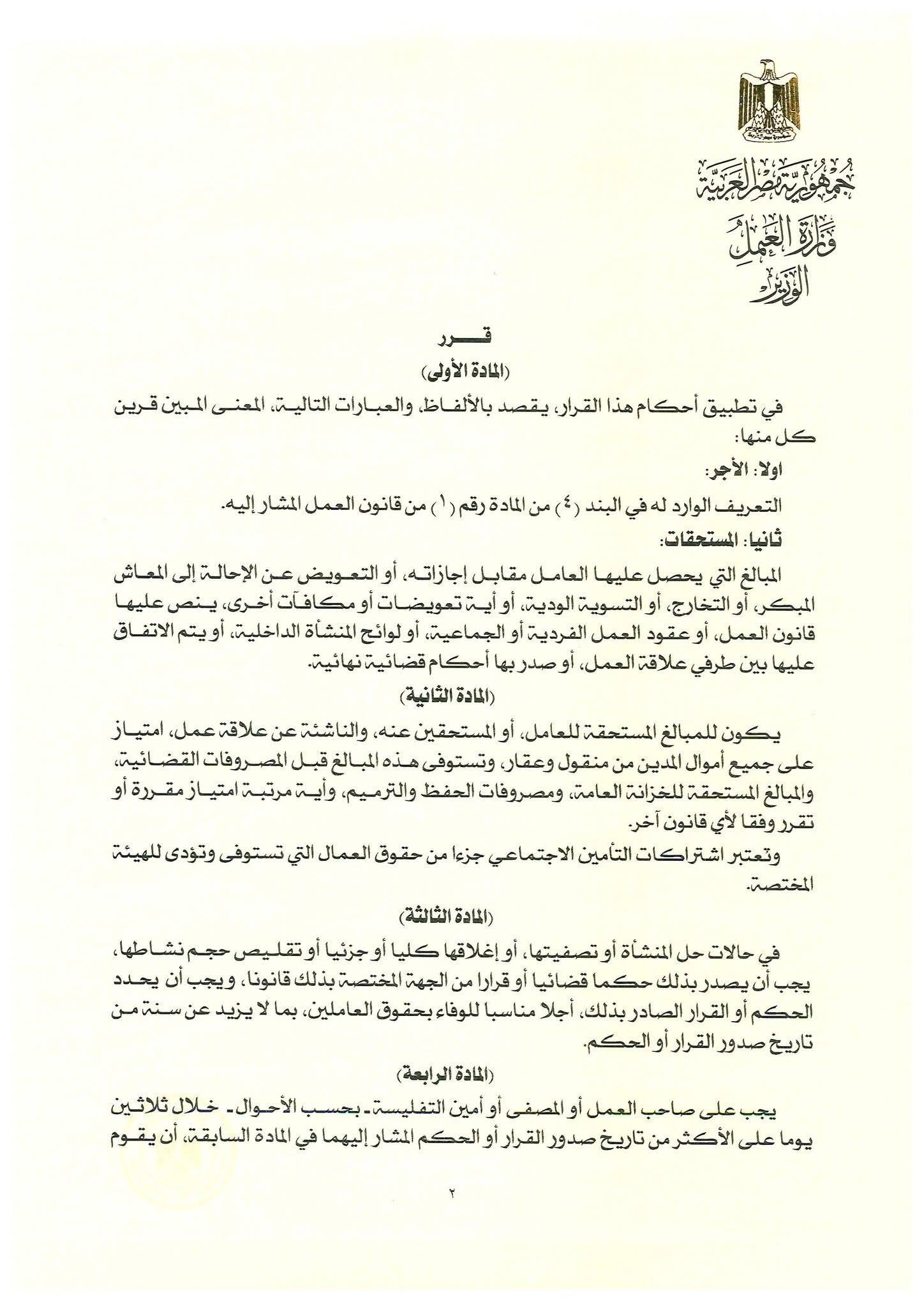 وأكد الوزير أن هذا القرار يأتي في إطار استكمال منظومة القرارات الوزارية التنفيذية لقانون العمل الجديد، وبما يحقق حماية حقوق العمال ويضمن عدم الإضرار بهم في مختلف الظروف الاقتصادية أو القانونية التي قد تمر بها المنشآت، موضحًا أن القانون نص صراحة على أن حل أو تصفية أو إفلاس المنشأة لا يمنع من الوفاء بكافة الالتزامات الناشئة عن علاقة العمل.