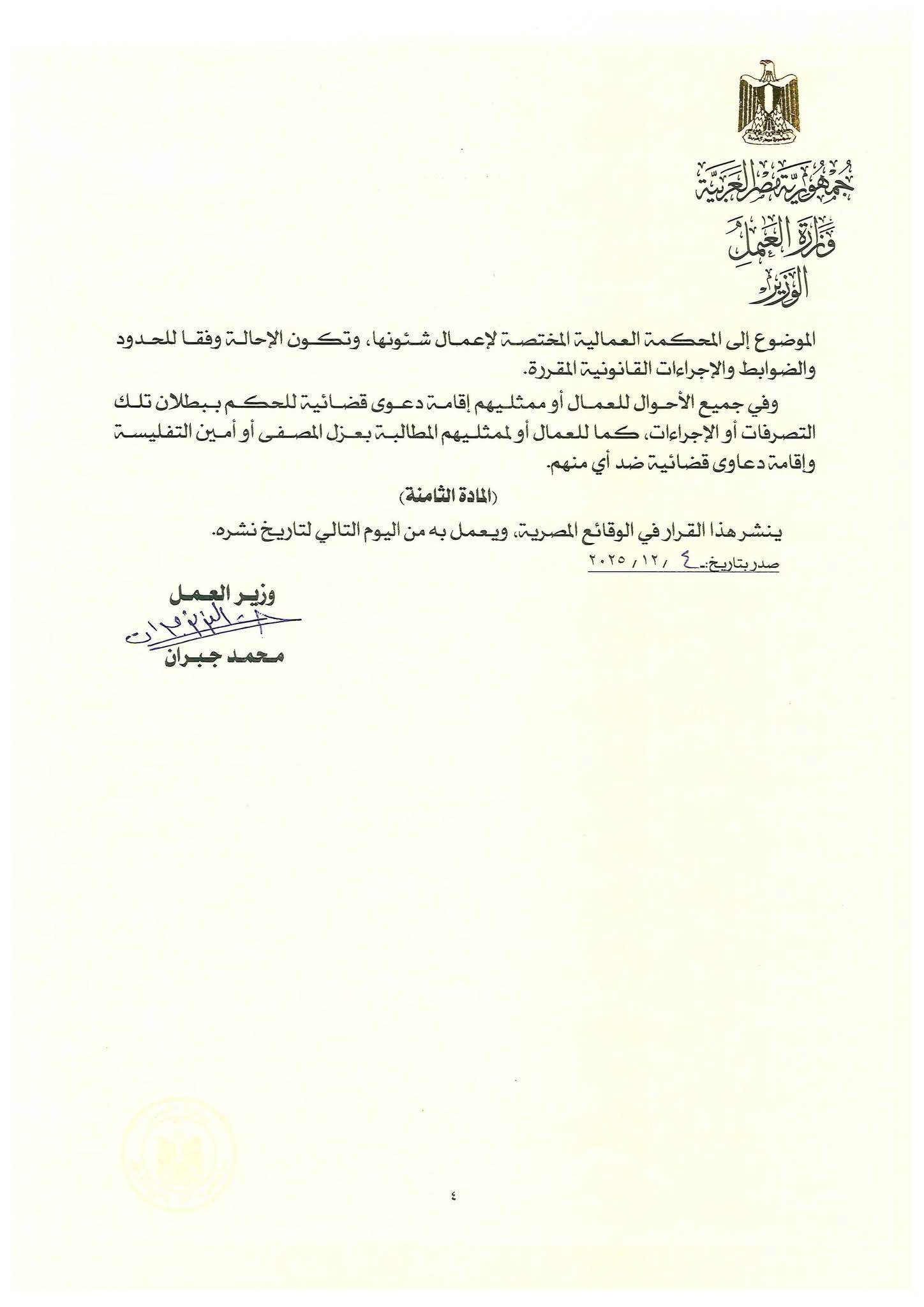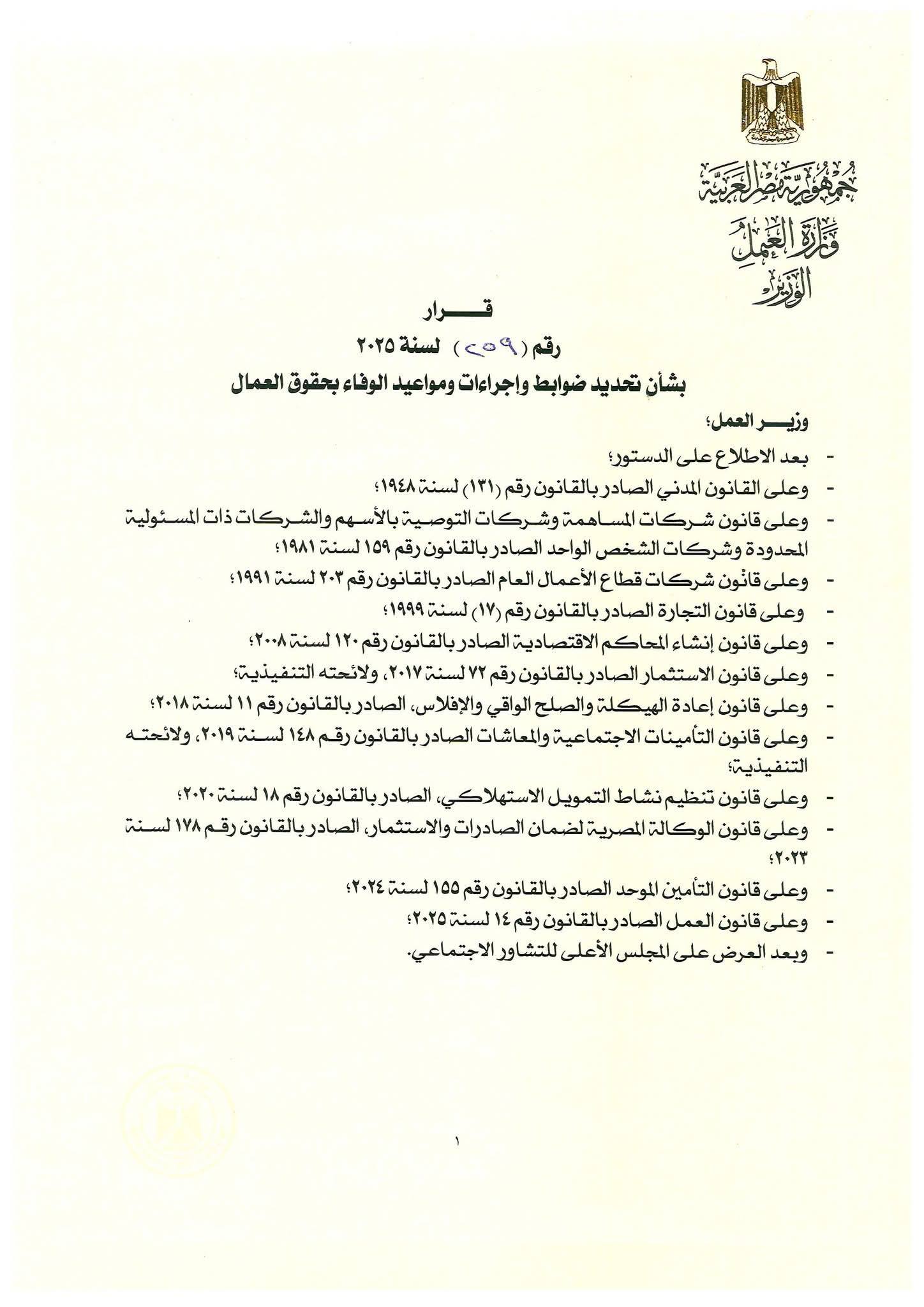 وزير العمل يصدر قرار وزاري رقم 259 لسنة 2025 لتنظيم صرف حقوق العمال