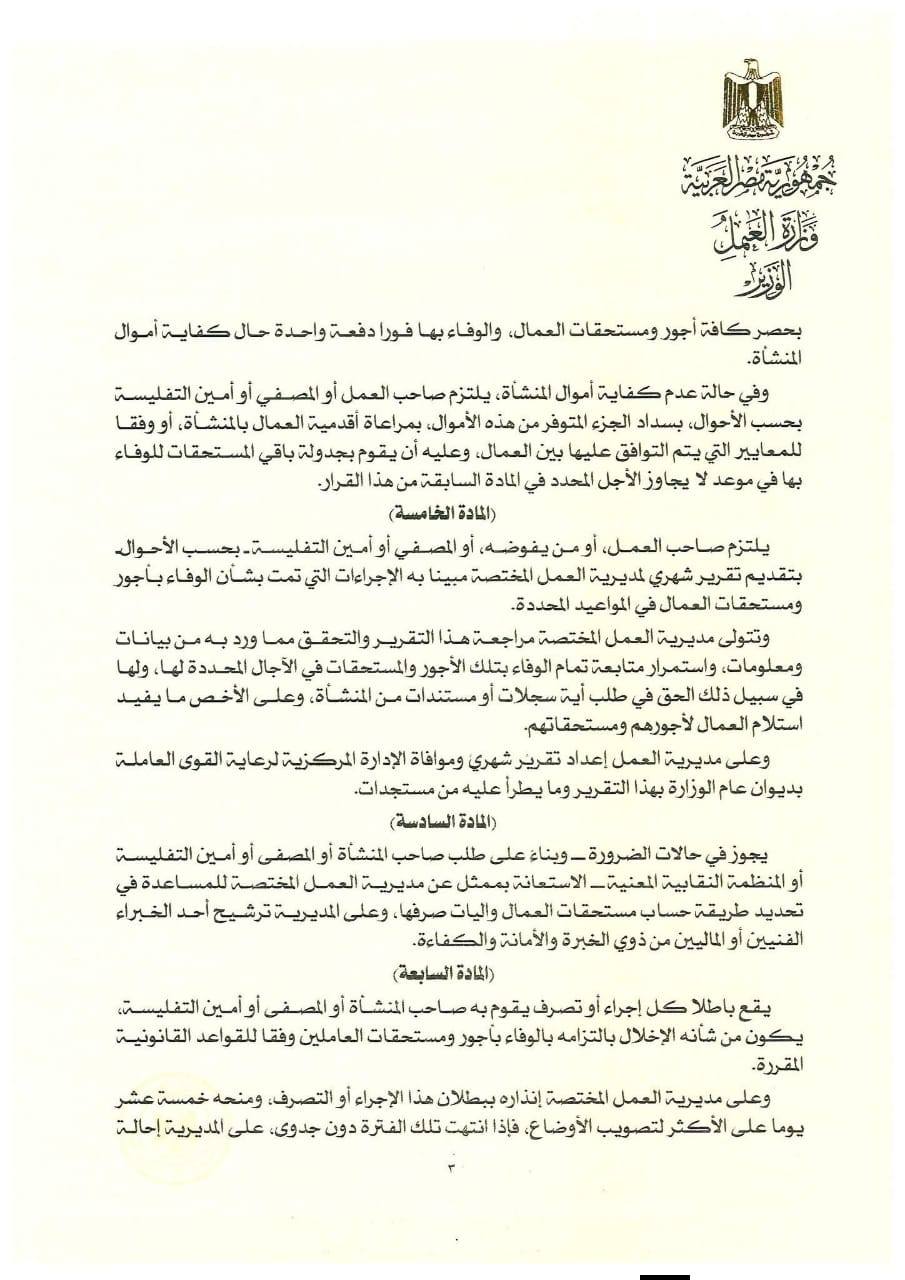 وأوضح وزير العمل أن القرار يضع إطارًا قانونيًا منضبطًا وواضحًا لمواعيد وآليات صرف الأجور والمستحقات، ويحدد مسؤوليات صاحب العمل أو المصفّي أو أمين التفليسة، مع إسناد دور رقابي وتنفيذي لمديريات العمل، بما يعزز من استقرار علاقات العمل ويحفظ التوازن بين أطراف العملية الإنتاجية.