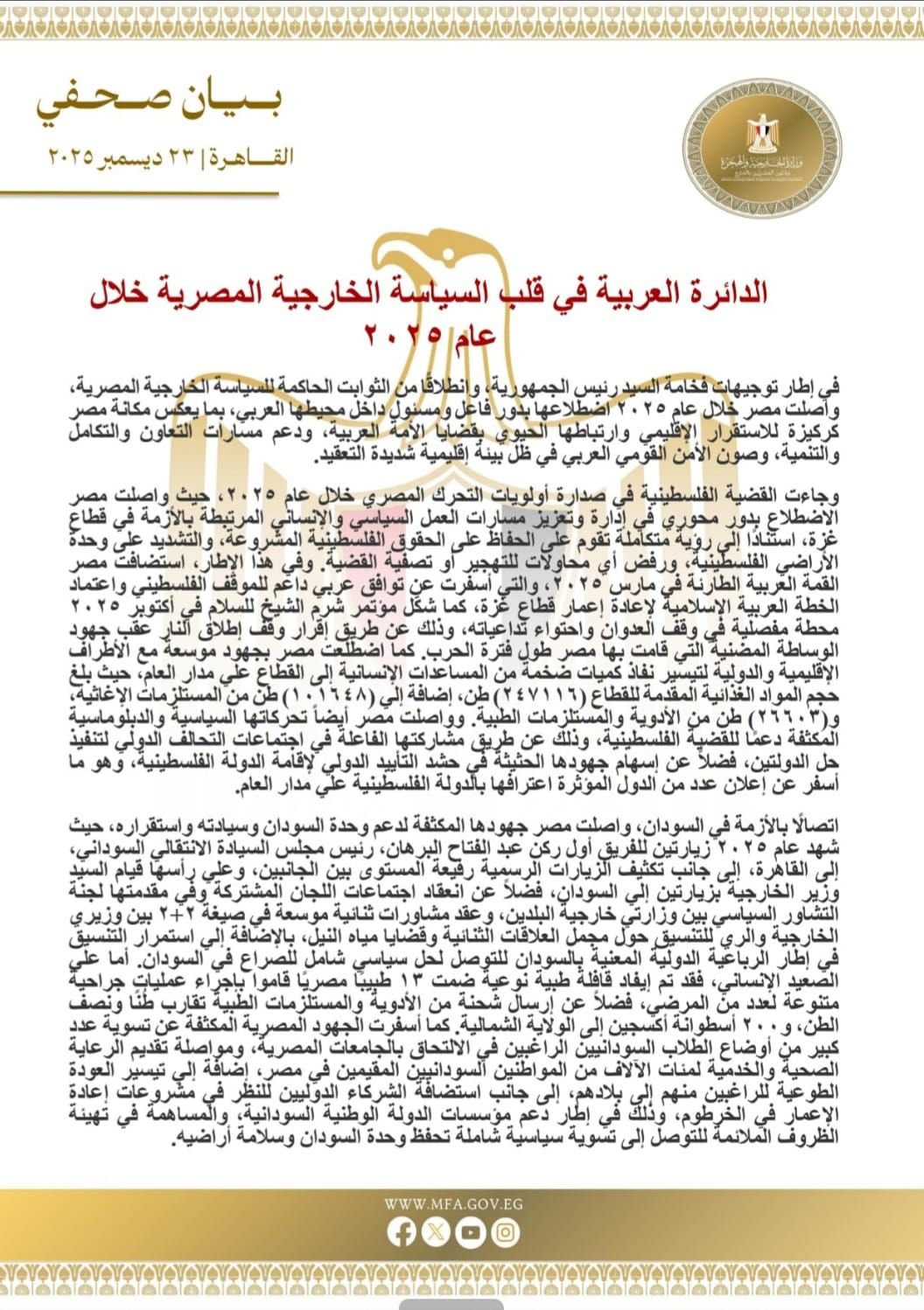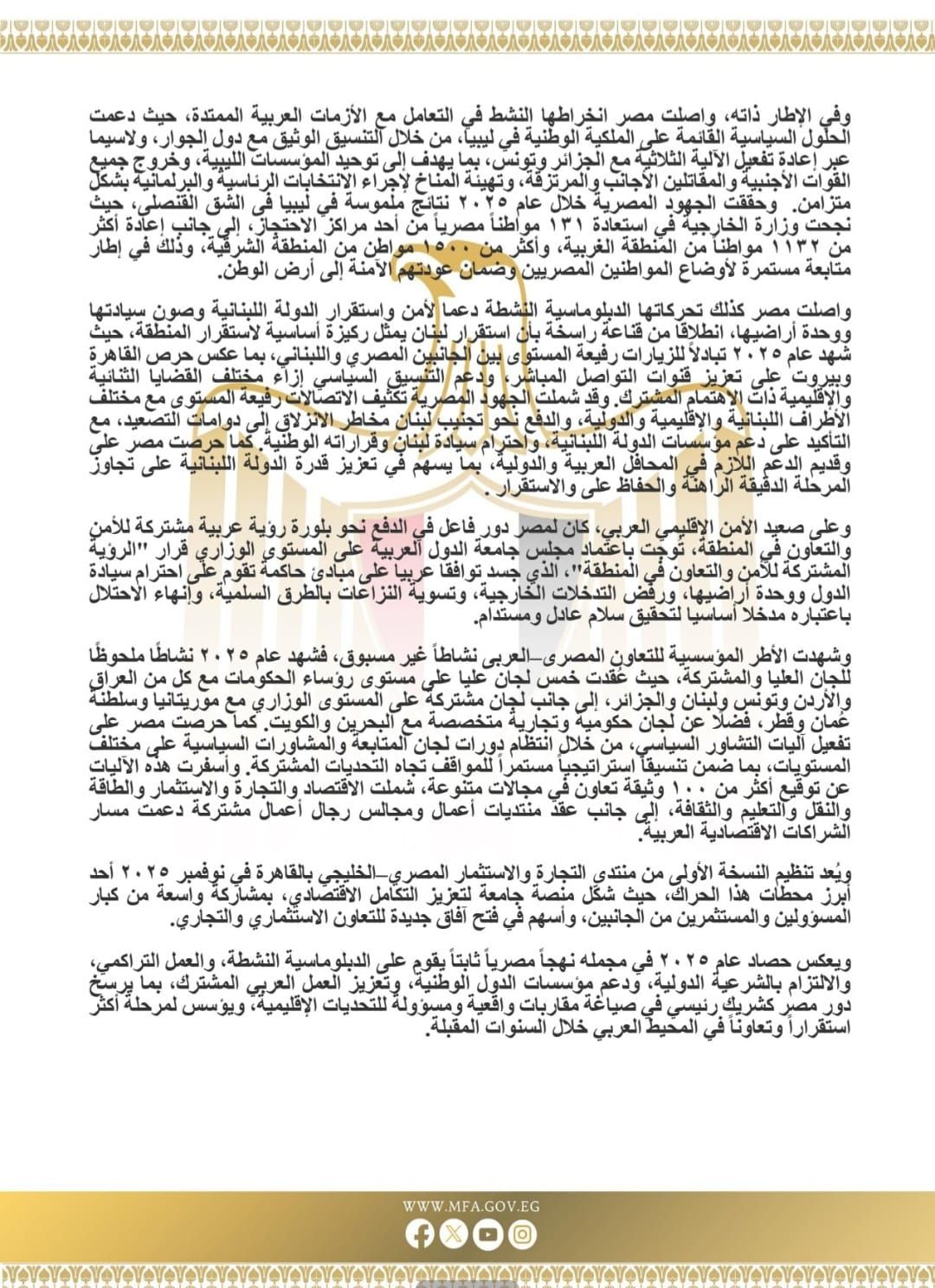 ويعكس حصاد عام ٢٠٢٥ في مجمله نهجاً مصرياً ثابتاً يقوم على الدبلوماسية النشطة، والعمل التراكمي، والالتزام بالشرعية الدولية، ودعم مؤسسات الدول الوطنية، وتعزيز العمل العربي المشترك، بما يرسخ دور مصر كشريك رئيسي في صياغة مقاربات واقعية ومسؤولة للتحديات الإقليمية، ويؤسس لمرحلة أكثر استقراراً وتعاوناً في المحيط العربي خلال السنوات المقبلة.