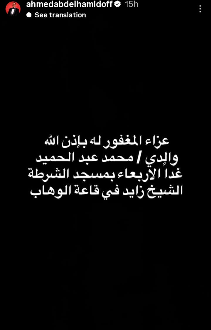 وكان أحمد عبدالحميد قد أعلن بالأمس عن موعد ومكان عزاء والده من خلال منشور كتبه عبر خاصية الاستوري على حسابه بموقع التواصل الاجتماعي “انستجرام”، والذي جاء كالتالي: “عزاء المغفور له بإذن الله والدي محمد عبدالحميد غدا الأربعاء بمسجد الشرطة في الشيخ زايد في قاعة الوهاب”.