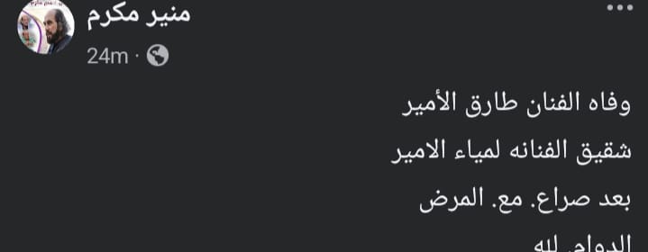 وأعلن الفنان منير مكرم سكرتير عام نقابة المهن التمثيلية وفاة طارق الأمير من خلال منشور كتبه عبر حسابه الرسمي عبر “فيسبوك"، والذي جاء كالتالي: "وفاة الفنان طارق الأمير شقيق الفنانة لمياء الأمير بعد صراع مع المرض، الدوام له.