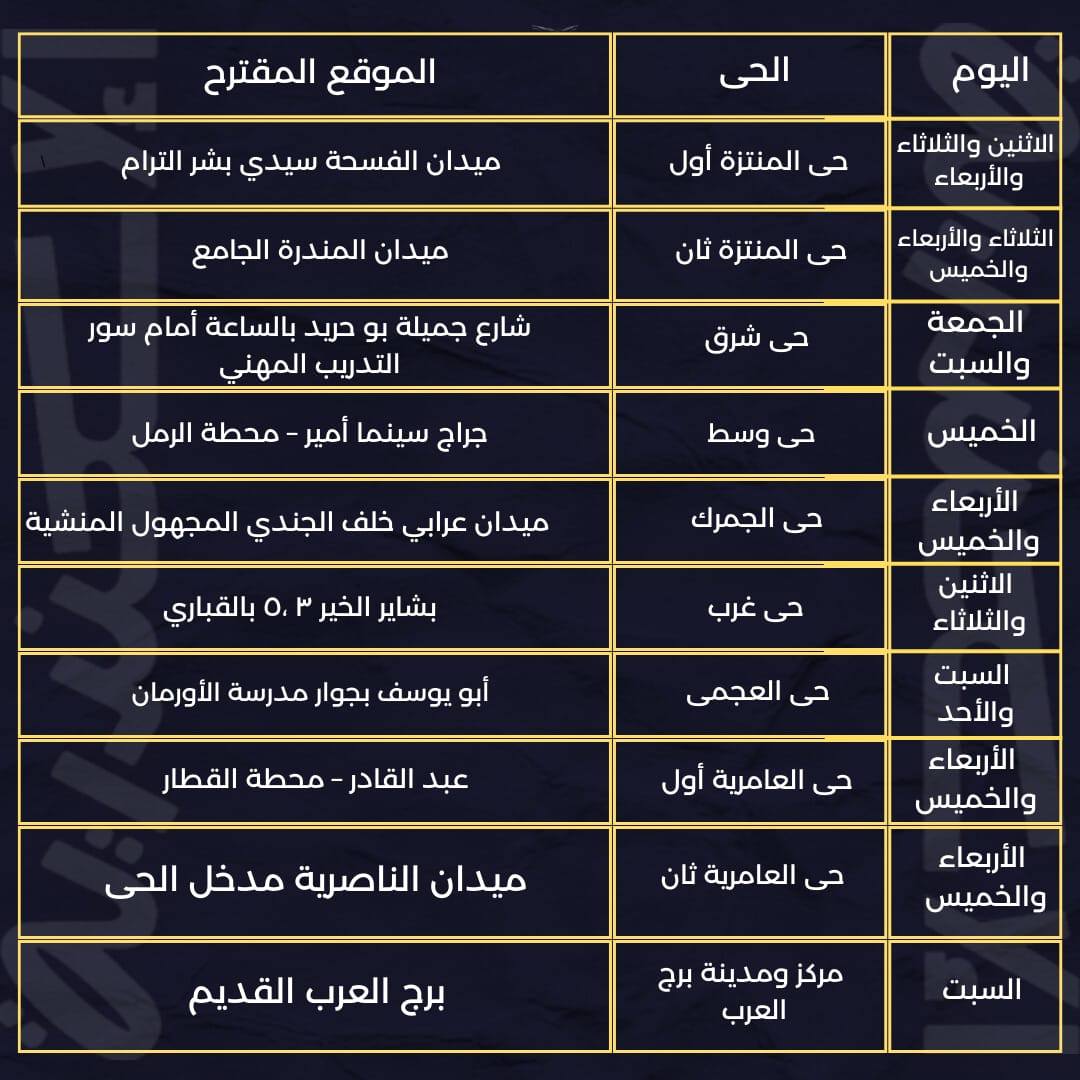 وفي حي شرق، يتم إقامة سوق اليوم الواحد بشارع جميلة بو حريد أمام سور التدريب المهني يومي الجمعة والسبت، ويشمل السوق 25 باكية، إضافة إلى سوق المزارعين بجراج سينما أمير بمحطة الرمل يوم الخميس من كل أسبوع، حيث يتوافر به 24 باكية وبنطاق حي غرب يومي الاثنين والثلاثاء من كل اسبوع ببشاير الخير 3 ،5 بالقباري