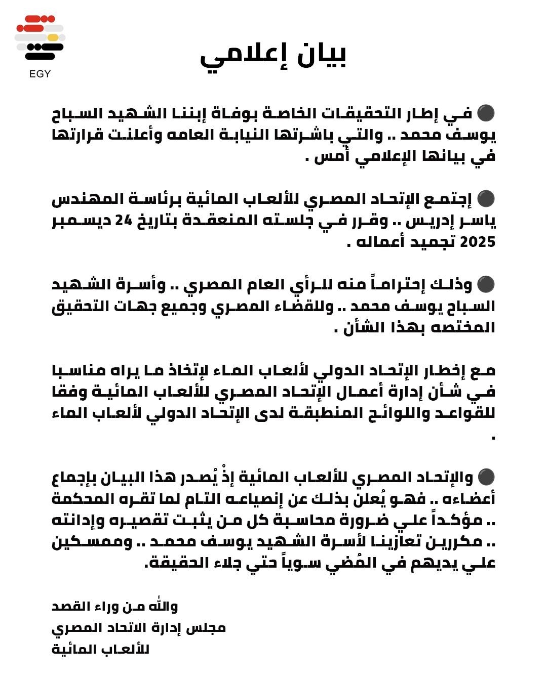 والإتحاد المصري للألعاب المائية إذ يصدر هذا البيان بإجماع أعضاءه .. فهو يُعلن بذلك عن إنصياعه التام لما تقره المحكمة ، مؤكداً على ضرورة محاسبة كل من يثبت تقصيره وإدانته ،مكررين تعازينا لأسرة الشهيد يوسف محمد .. وممسكين علي يديهم في المضي سوياً حتي جلاء الحقيقة.