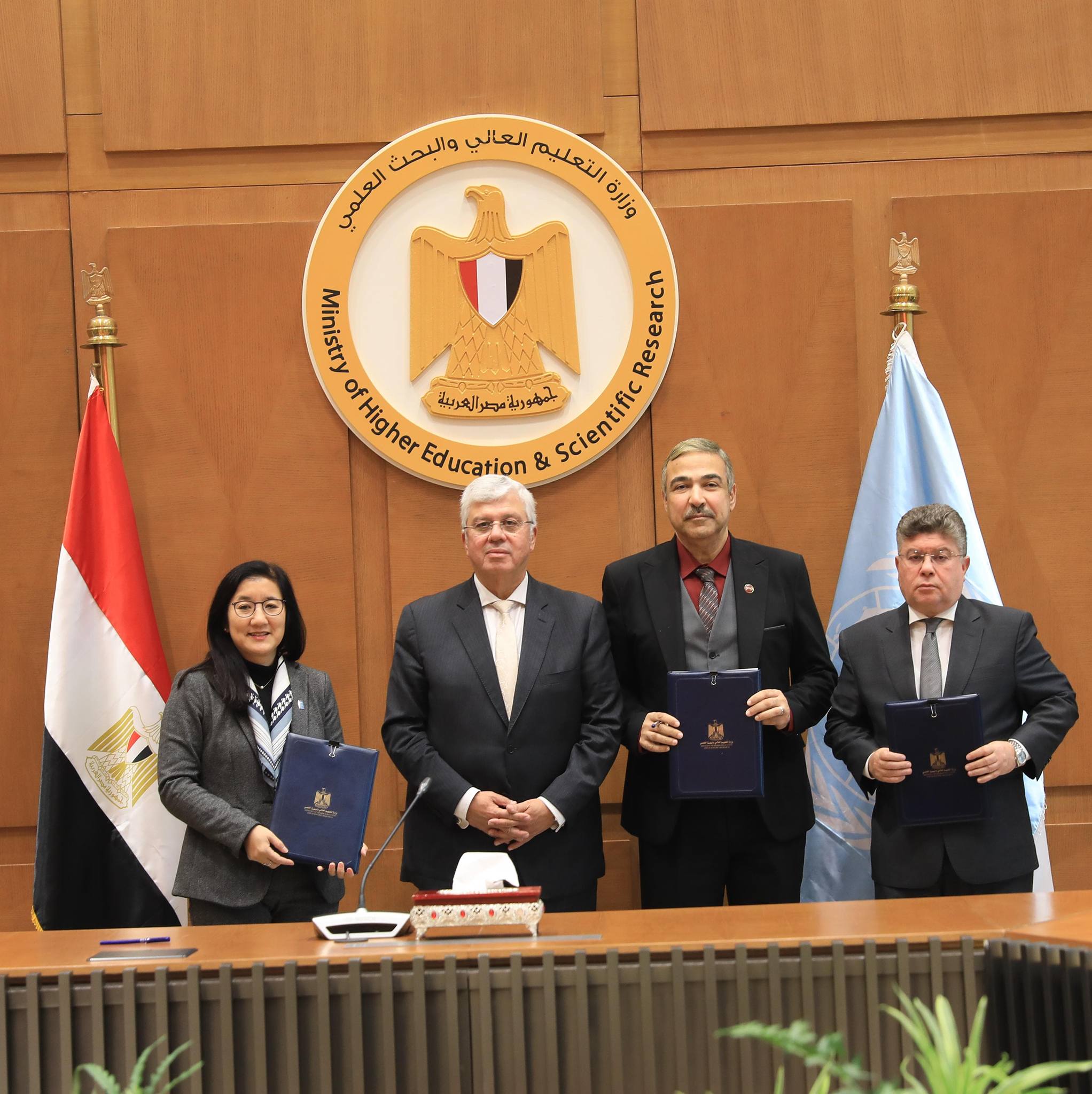 وقع الاتفاق، الدكتور حسام عثمان، نائب وزير التعليم العالي والبحث العلمي لشؤون الابتكار والذكاء الاصطناعي والبحث العلمي، و السفير خالد أنيس، مساعد وزير الخارجية ومدير إدارة التعاون الدولي للتنمية، وتشيتوسي نوجوتشي - الممثل المقيم لبرنامج الأمم المتحدة الإنمائي.