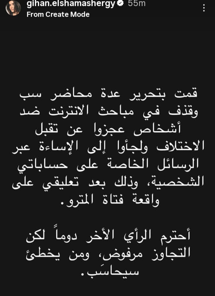 وكتبت جيهان الشماشرجي منشورا عبر خاصية الإستوري على حسابها بموقع التواصل الاجتماعي “انستجرام”، وعلقت عليها قائلة: “قمت عدة محاضر سب وقذف في مباحث الإنترنت ضد أشخاص عجزوا عن تقبل الإختلاف، ولجأوا إلى الرسائل الخاصة على حساباتي الشخصية، وذلك بعد تعليقي على واقعة فتاة المترو، احترم الرأي الآخر دوما، لكن التجاوز مرفوض، ومن يخطئ سيحاسب”.