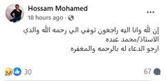 وأعلن نجله حسام محمد عبده وفاة والده، حيث كتب منشورا عبر حسابه الشخصي بموقع “فيسبوك”، والذي جاء كالتالي: ""إنا لله وانا اليه راجعون، توفي الي رحمه الله والدي الأستاذ/محمد عبده، إرجو الدعاء له بالرحمة والمغفرة".