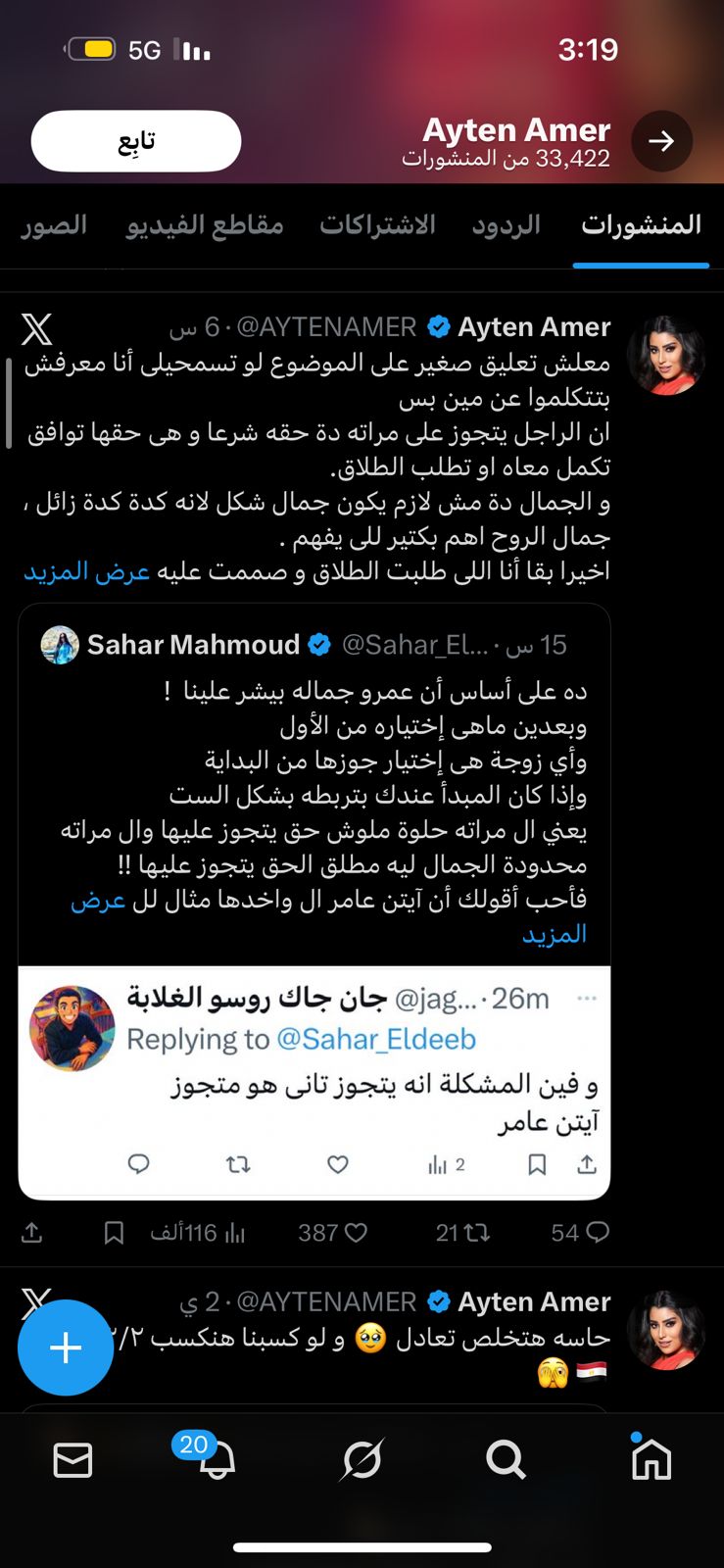 وكتبت أيتن عامر منشورا عبر حسابها الرسمي بموقع "إكس"، والذي جاء كالتالي: " معلش تعليق صغير على الموضوع لو تسمحيلى أنا معرفش بتتكلموا عن مين بس ان الراجل يتجوز على مراته دة حقه شرعا و هى حقها توافق تكمل معاه او تطلب الطلاق. و الجمال دة مش لازم يكون جمال شكل لانه كدة كدة زائل ، جمال الروح اهم بكتير للى يفهم . اخيرا بقا أنا اللى طلبت الطلاق و صممت عليه دى معلومة معرفش هتفيدك فى حاجة ولا لا