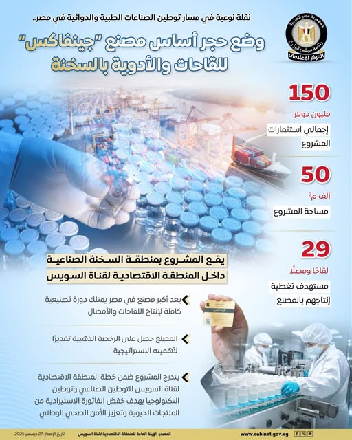 في خطوة نوعية نحو توطين الصناعات الطبية والدوائية وتعزيز الاكتفاء الذاتي من المنتجات الحيوية، تم اليوم وضع حجر أساس مصنع "جينفاكس" للقاحات والأدوية بمنطقة السخنة الصناعية داخل المنطقة الاقتصادية لقناة السويس.