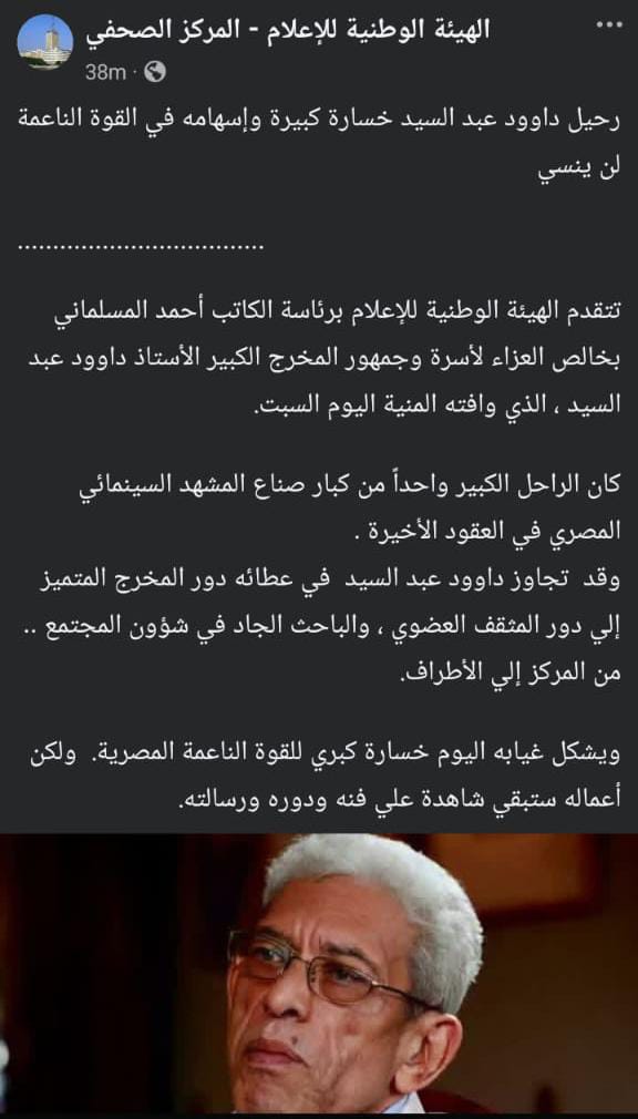 نعت الهيئة الوطنية للإعلام برئاسة الكاتب الصحفي أحمد المسلماني المخرج داوود عبد السيد الذي رحل عن عالمنا منذ قليل.