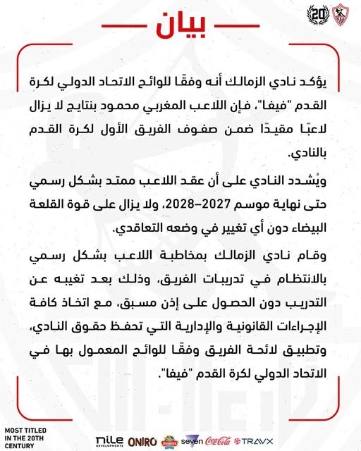 ردًا على التصريحات التي أُثيرت الجدل من أحمد عبدالروؤف مدرب الفريق خلال المؤتمر الصحفي الأخير بعد الفوز علي بلدية المحلة، أصدر نادي الزمالك بيانًا رسميًا لتوضيح الموقف القانوني والتعاقدي للاعب المغربي محمود بنتايج، مؤكدًا التزامه الكامل بلوائح الاتحاد الدولي لكرة القدم «فيفا» وحفظ حقوق النادي.