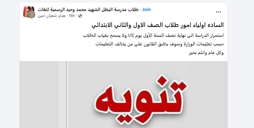 أعلنت الصفحات الرسمية للمدارس على موقع فيس بوك عن صدور تعليمات تنص على استمرار الدراسة وانتظام الحصص الدراسية لتلاميذ الصفين الأول والثاني الابتدائي حتى يوم 14 يناير 2026.